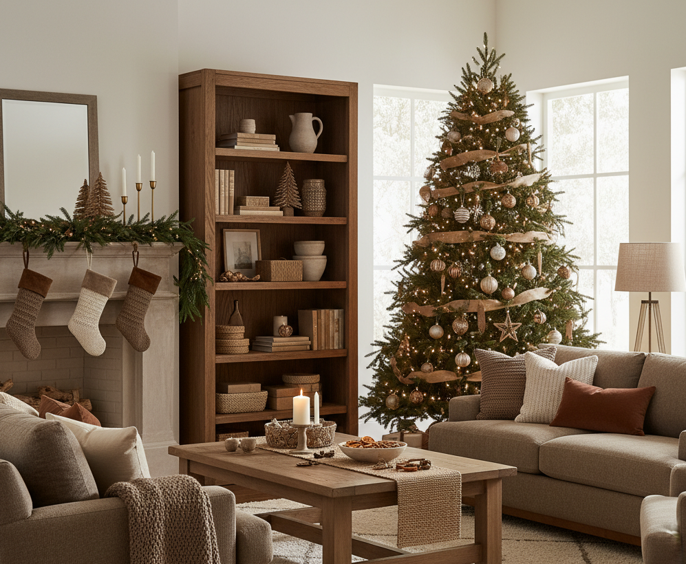 Masívny nábytok alebo nábytok v prírodných odtieňoch prináša pocit domova a tepla počas celého roka – no počas Vianoc to platí dvojnásobne. Drevo a jeho imitácia patria medzi základné prvky sviatočného interiéru. Takýto nábytok nielenže dodáva priestoru pocit dokonalosti, ale zároveň sa hodí ku každej farebnej kombinácii výzdoby. Vďaka svojej nadčasovosti a univerzálnosti je vhodný do každého domova.