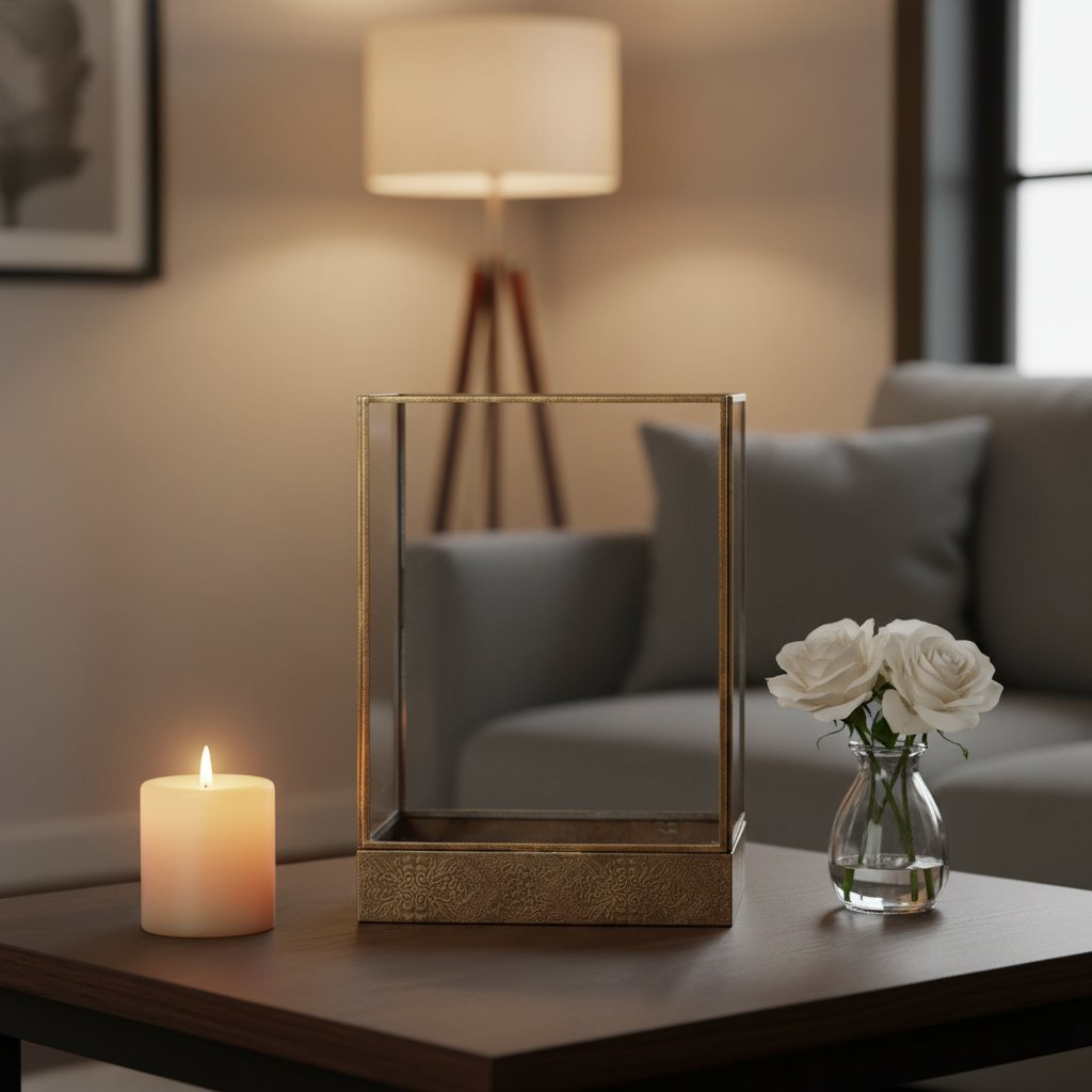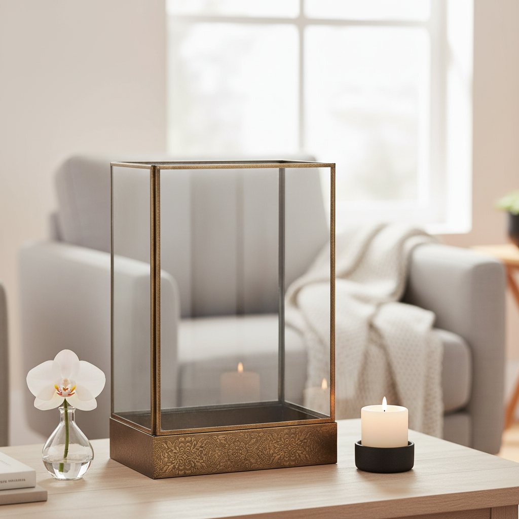 Tento elegantný lampión so sklenenými stenami a kovovým rámom v zlatej patine prinesie do vášho domova nádych luxusu a harmónie. Vďaka svojmu čistému, nadčasovému dizajnu sa skvele hodí do moderných aj klasických interiérov. Krásne vynikne so sviečkou, ktorá vytvorí príjemnú, teplú atmosféru počas večerných chvíľ. Lampión je tiež štýlovým doplnkom na stolík, poličku či do vstupného priestoru.