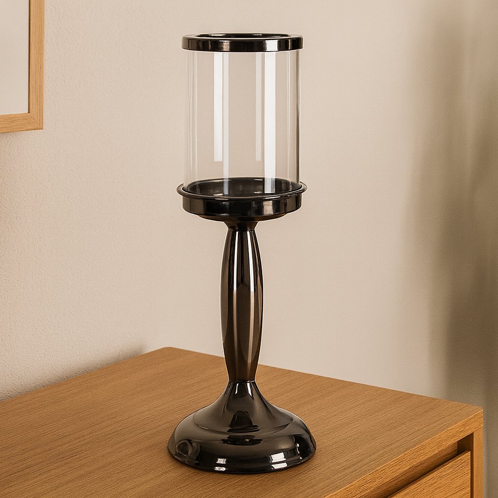 Sklenený valec chráni plameň a zároveň zvýrazňuje jeho svetlo, zatiaľ čo kovová základňa zaručuje stabilitu a elegantný vzhľad. Svietnik so zapálenou sviečkou nikdy nenechávajte bez dozoru dospelej osoby.