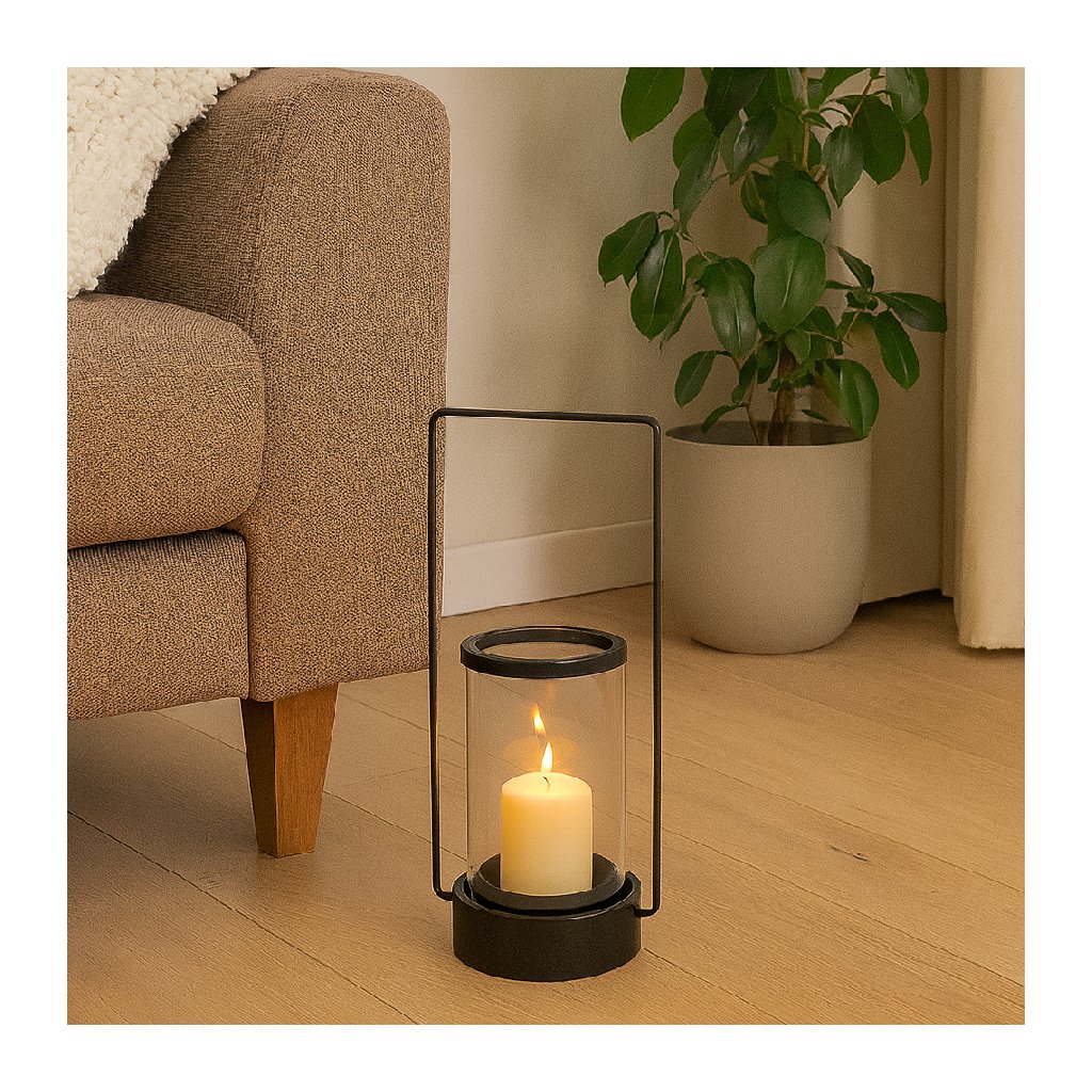 Vytvorte si doma príjemnú a elegantnú atmosféru s týmto dekoratívnym svietnikom WIKI z kombinácie kovu a skla. Jeho moderný dizajn v čiernej farbe zaujme čistými líniami a minimalistickým tvarom, vďaka čomu sa hodí do každého štýlu interiéru – od industriálneho po škandinávsky. Tento čierny svietnik je nielen praktickým, ale aj dizajnovým doplnkom – vynikne na zemi vedľa gauča, na komode alebo ako súčasť sezónnej dekorácie.