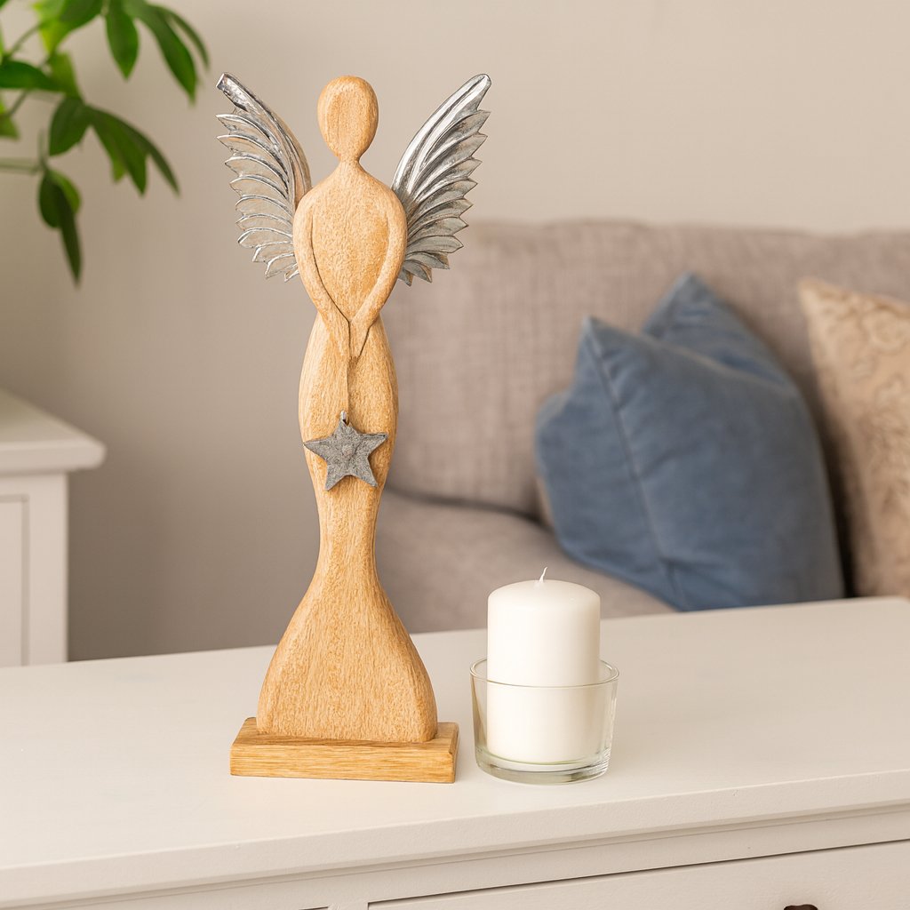 Vneste do svojho domova pokoj, svetlo a eleganciu s naším dreveným anjelom 134B so striebornými krídlami. Tento jedinečný dizajnový doplnok je ručne vyrobený z kvalitného dreva a doplnený o lesklé kovové krídla, ktoré mu dodávajú jemný, no výrazný kontrast. Minimalistická silueta anjela vyžaruje čistotu, rovnováhu a duchovnú energiu, vďaka čomu sa dokonale hodí do moderných aj tradičných interiérov. Hviezda v rukách symbolizuje nádej a svetlo – krásny detail, ktorý dotvára jeho výnimočný charakter.