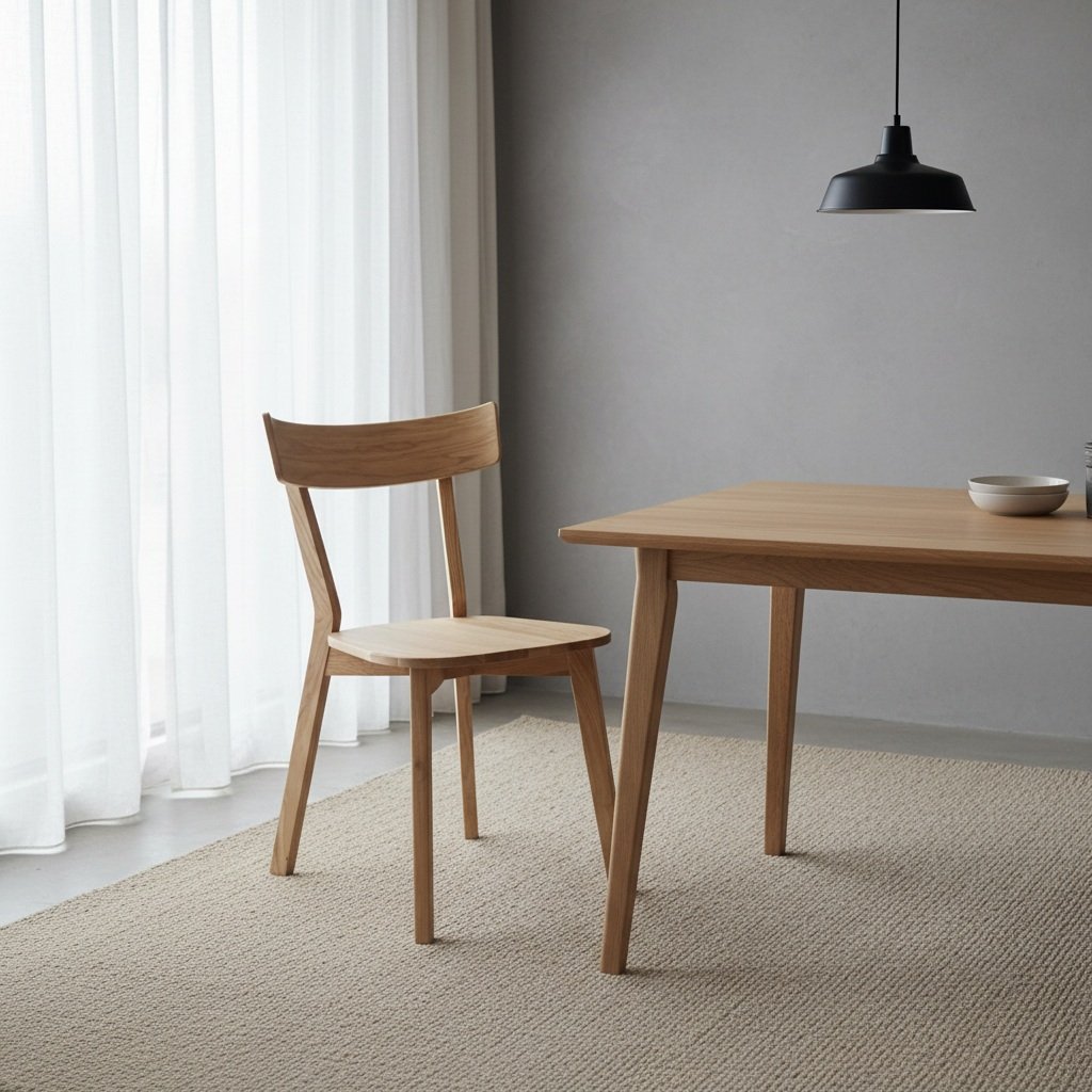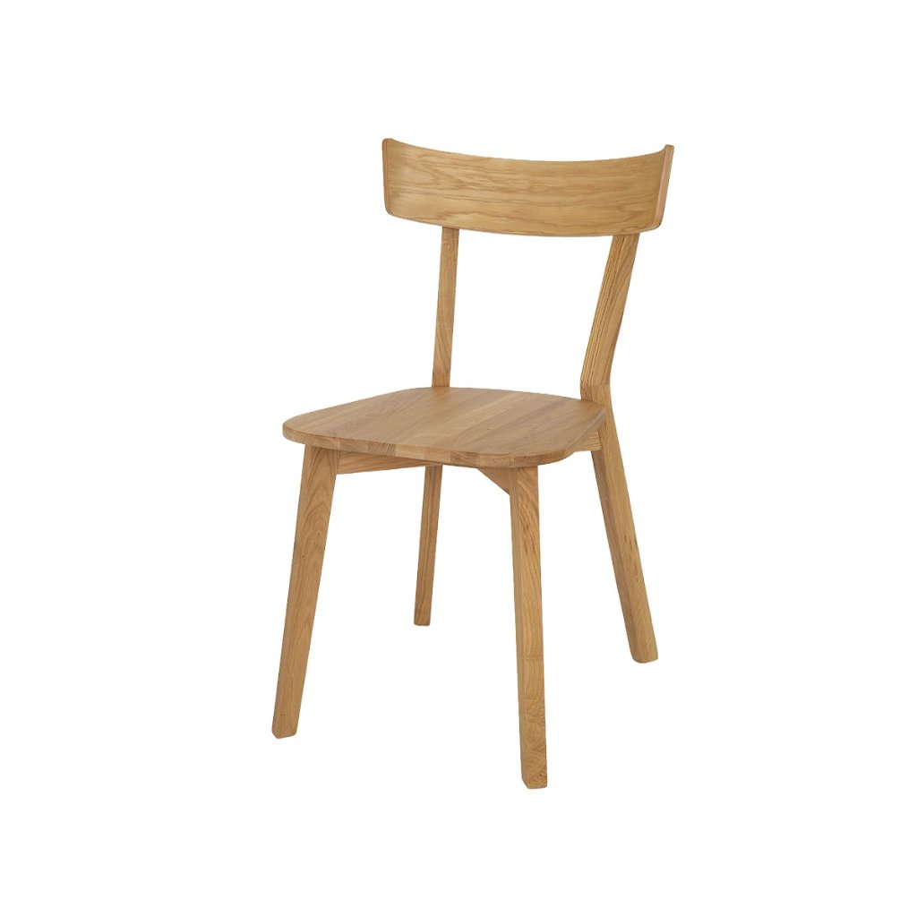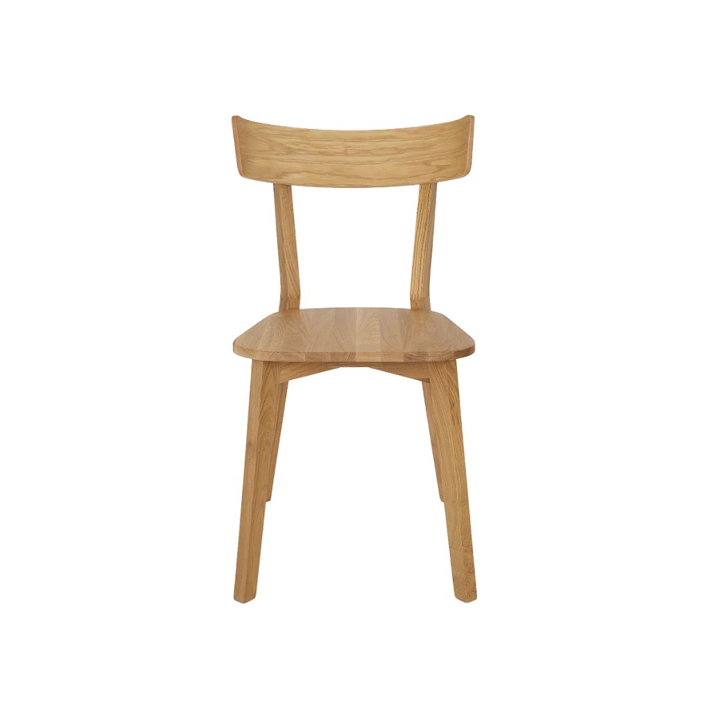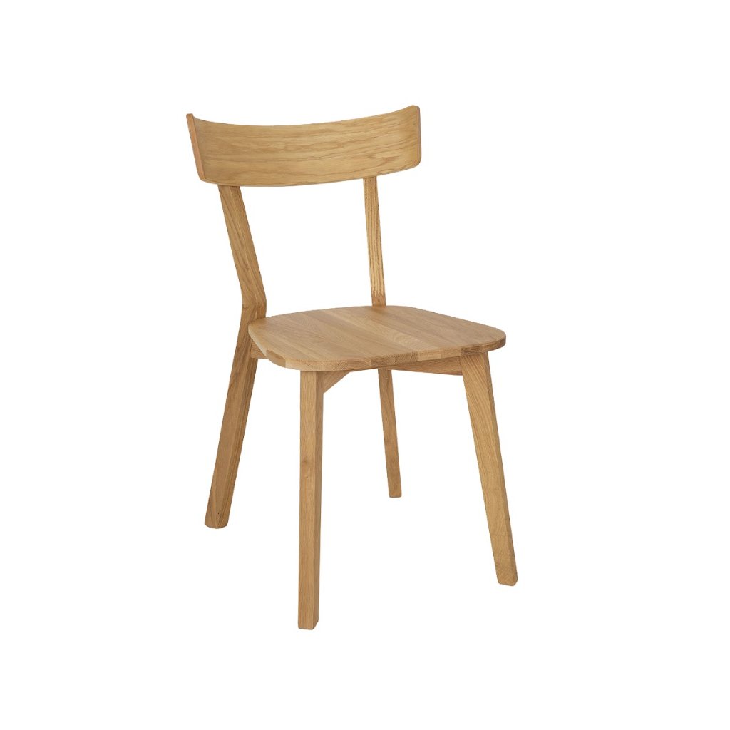 Jedálenská stolička má konštrukciu vyrobenú z dubového dreva, ktoré zaručuje pevnosť, stabilitu a dlhú životnosť, zatiaľ čo drevený sedák ponúka minimalistický dizajn bez čalúnenia pre jednoduchú údržbu.