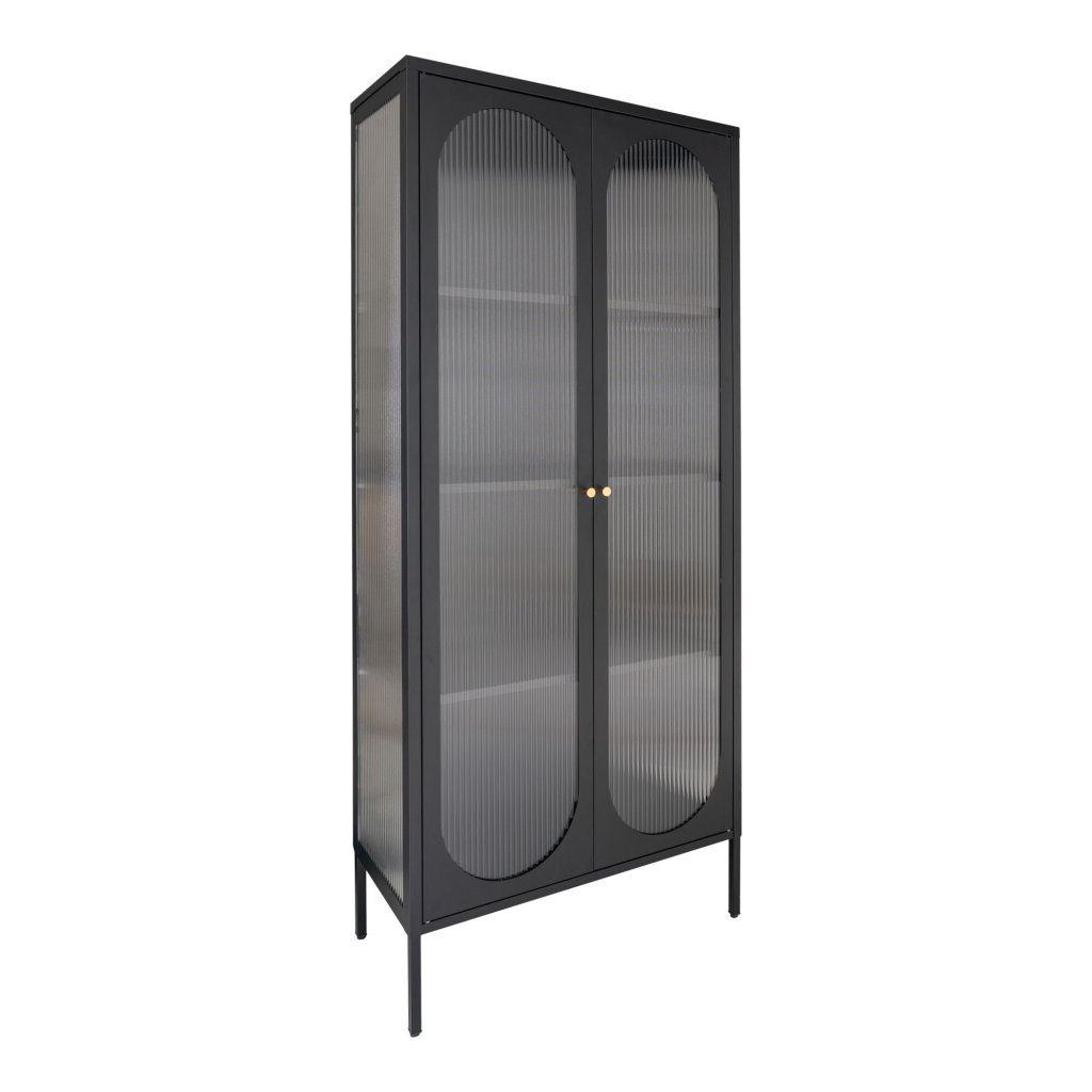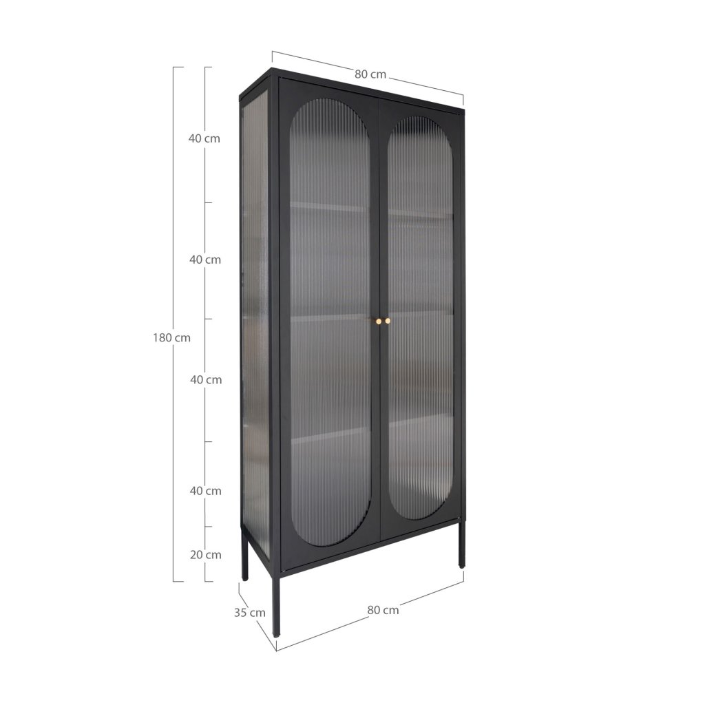 Moderná vitrína v tmavom prevedení spája elegantný dizajn s praktickou funkčnosťou. Dvojdverové presklené dvierka s jemne štruktúrovaným sklom umožňujú decentne vystaviť riad, knihy či dekorácie, pričom zachovávajú súkromie uložených predmetov. Kovová konštrukcia zaručuje stabilitu a dlhú životnosť, zatiaľ čo zlaté úchytky dodávajú nábytku nádych luxusu. Vitrína sa výborne hodí do moderných aj industriálnych interiérov, kde sa stane výrazným dizajnovým prvkom.