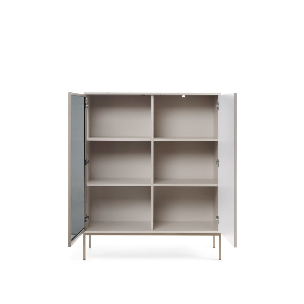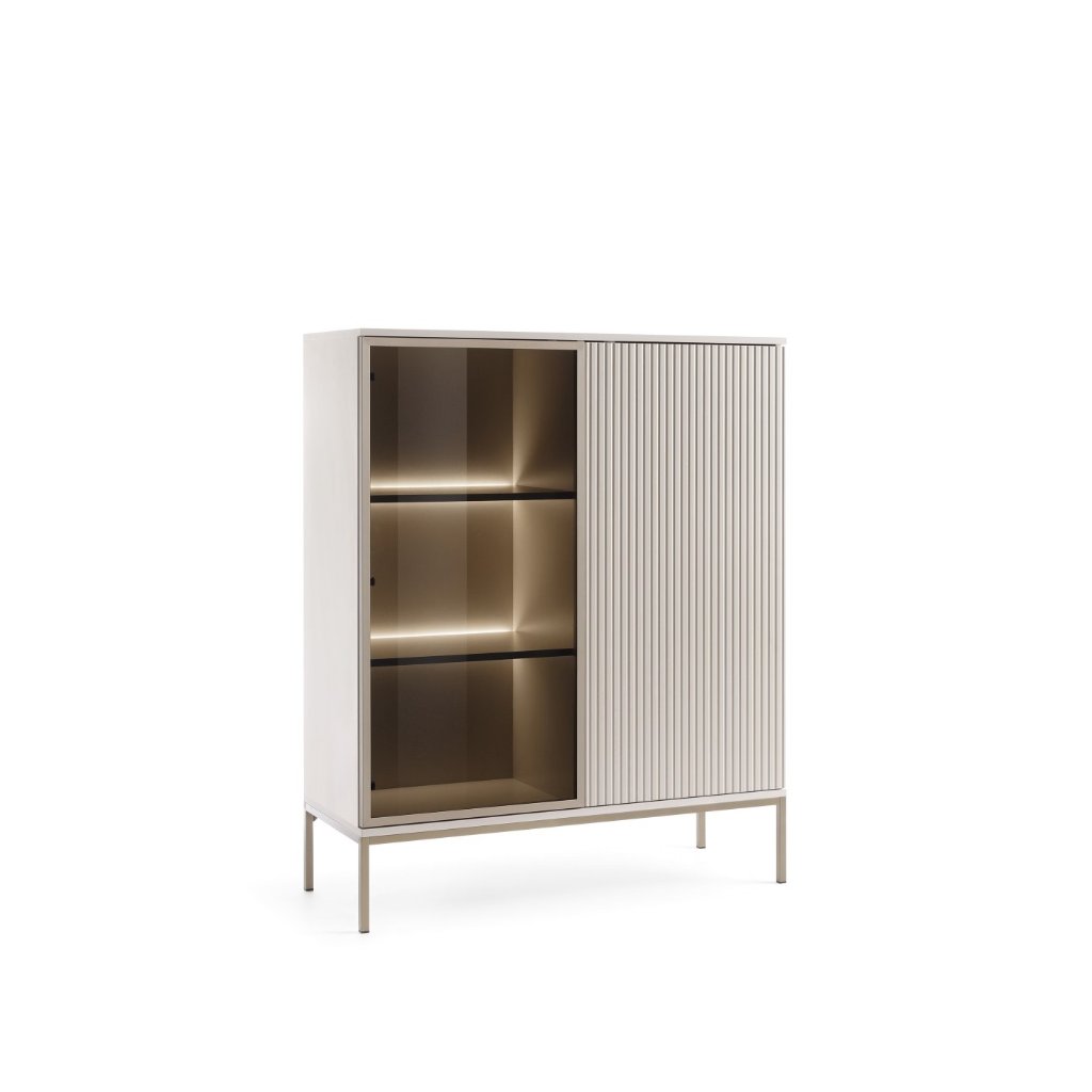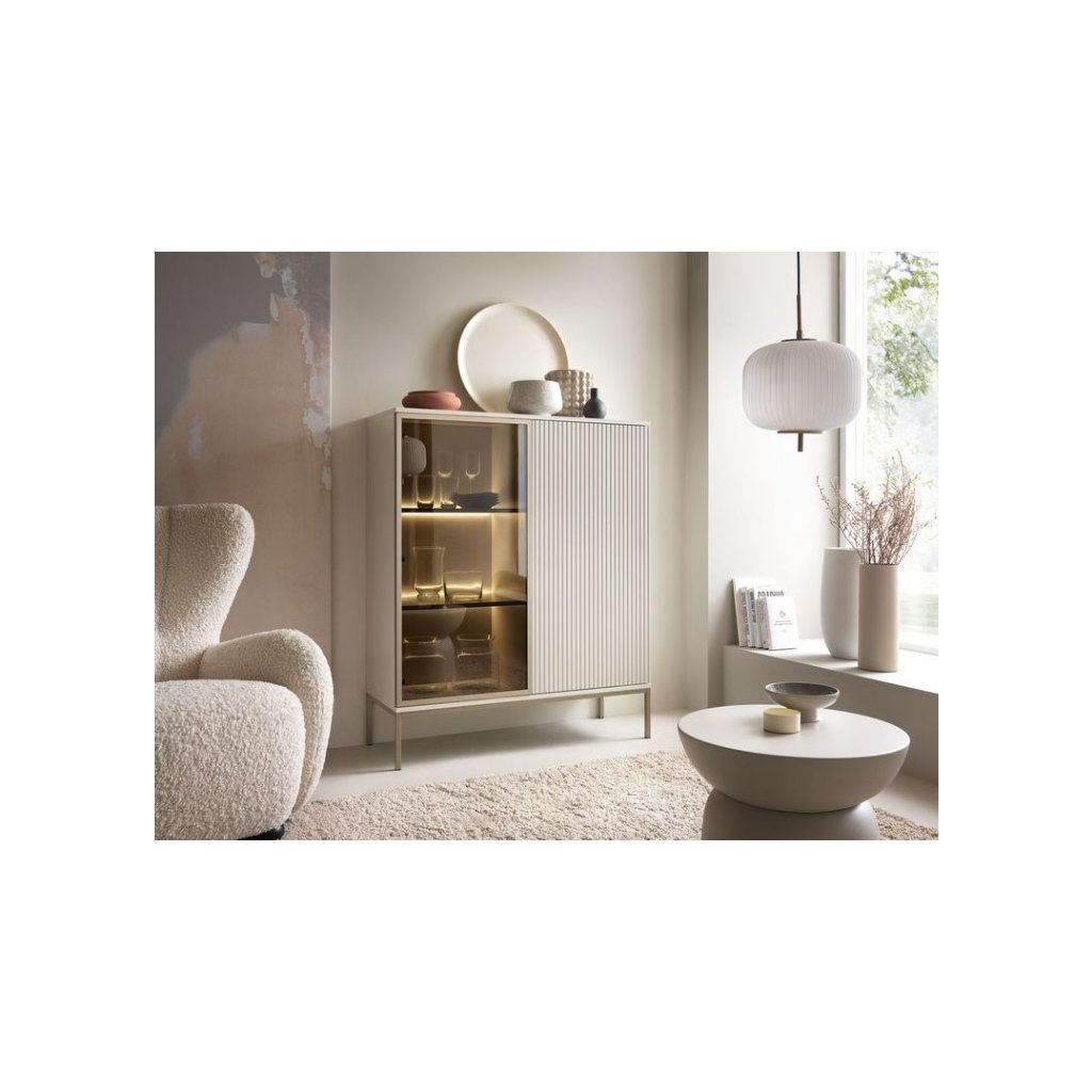 Ak hľadáte modernú, kvalitnú a funkčnú zostavu do obývačky, vitrína INTENSO WT104 je tou správnou voľbou. Elegantné farebné prevedenie cashmere dodáva interiéru jemnosť, štýl a nadčasový charakter. Vitrína je postavená na vysokých kovových nohách, ktoré jej dodávajú ľahkosť a vzdušný vzhľad, pričom zároveň uľahčujú čistenie priestoru pod nábytkom. Lamelové detaily na dvierkach vnášajú do dizajnu zaujímavú textúru a hĺbku, zatiaľ čo presklená časť s integrovaným LED osvetlením vytvára príjemnú atmosféru a zvýrazňuje jedinečný štýl vitríny. Vitrína má dvoje dvierka, z ktorých jedny sú presklené – ideálne na vystavenie dekorácií, skla či obľúbených doplnkov. O pohodlné používanie sa stará moderný systém PUSH TO OPEN, ktorý umožňuje jednoduché otváranie bez úchytiek a podčiarkuje čistý minimalistický dizajn.