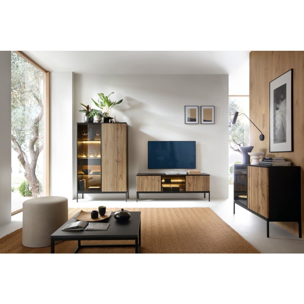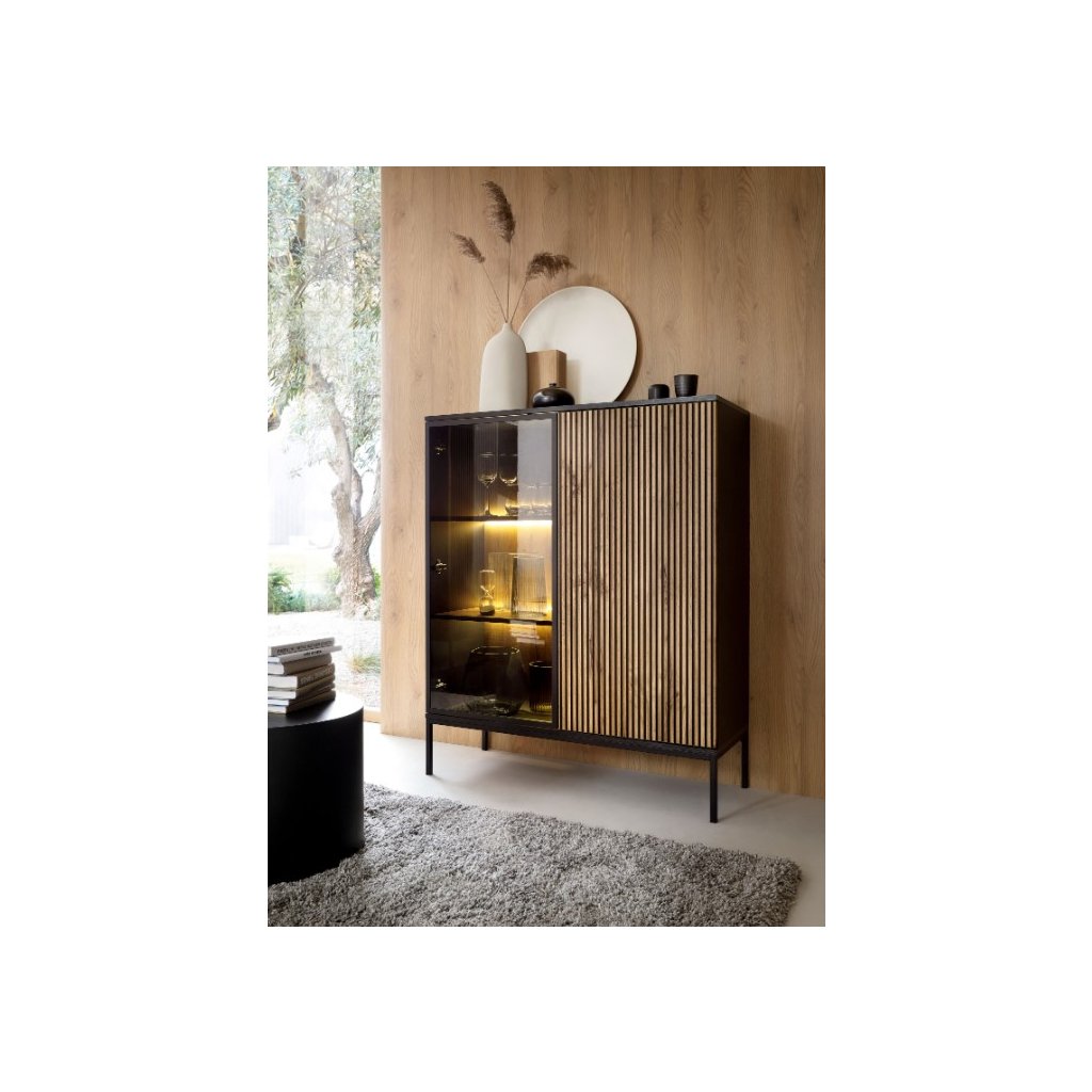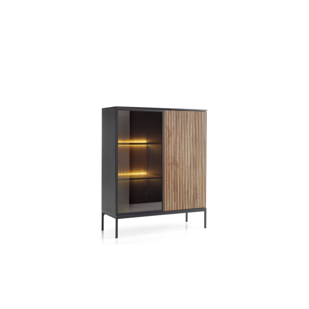 Ak hľadáte modernú, kvalitnú a funkčnú zostavu do obývačky, vitrína INTENSO WT104 je tou správnou voľbou. Elegantný dizajn na vysokých kovových nohách dodáva interiéru ľahkosť, vzdušnosť a moderný vzhľad. Vitrína je vyrobená z pevnej a odolnej konštrukcie, ktorá zaručuje stabilitu a dlhú životnosť. Lamelové detaily na dvierkach vnášajú do priestoru zaujímavý dizajnový prvok, zatiaľ čo presklená časť s integrovaným LED osvetlením vytvára príjemnú atmosféru a elegantne zvýrazňuje jedinečný štýl nábytku. Vitrína má dvoje dvierka, z ktorých jedny sú presklené, ideálne na vystavenie dekorácií či obľúbených doplnkov. O komfortné používanie sa stará praktický systém PUSH TO OPEN, ktorý umožňuje jednoduché otváranie bez úchytiek a podčiarkuje čistý minimalistický vzhľad.