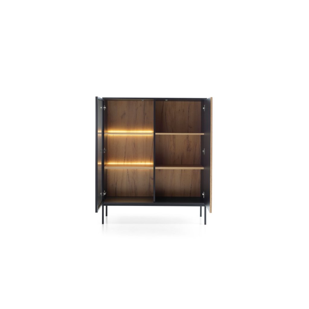Dizajnová vitrína INTENSO je vyrobená z kvalitného laminátu v kombinácii s MDF doskou s hrúbkou 18 mm použitou na dvierkach, čo zaručuje pevnosť, stabilitu a dlhú životnosť nábytku. Vyššie kovové nohy dodávajú vitríne ľahkosť a moderný vzhľad, pričom zároveň umožňujú jednoduché čistenie priestoru pod nábytkom. ABS hrany poskytujú spoľahlivú ochranu pred poškodením a zvyšujú odolnosť pri každodennom používaní.