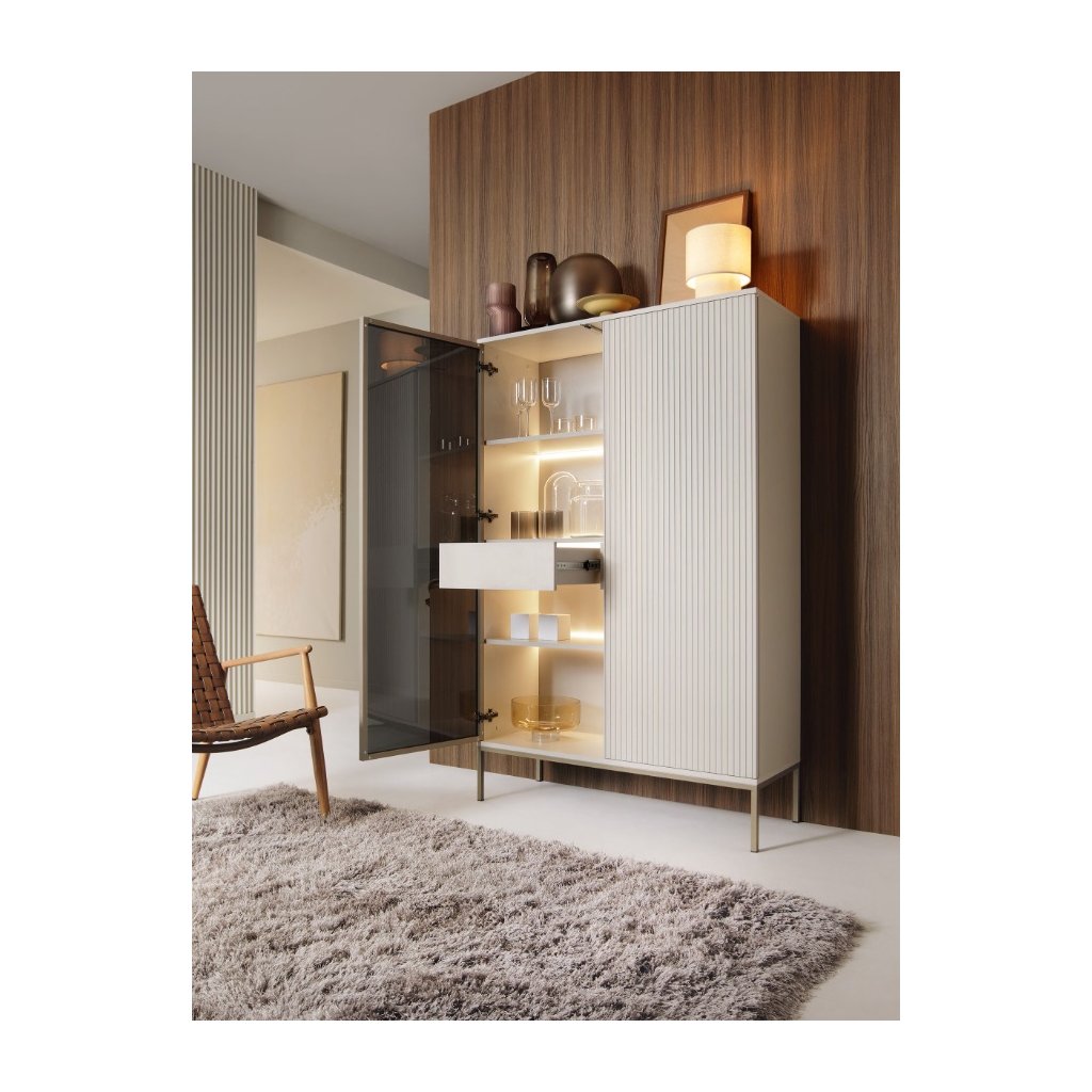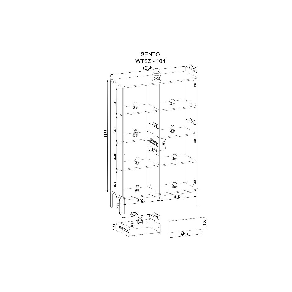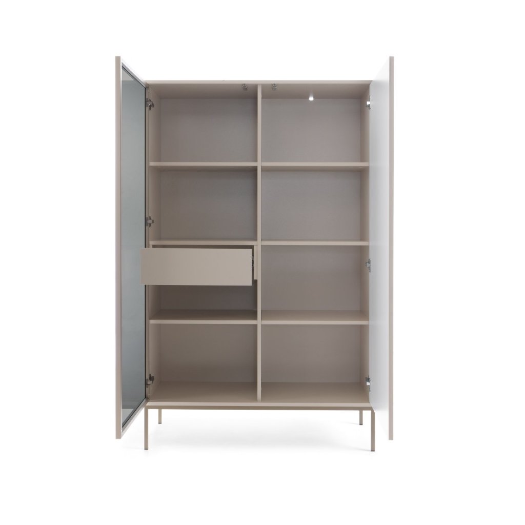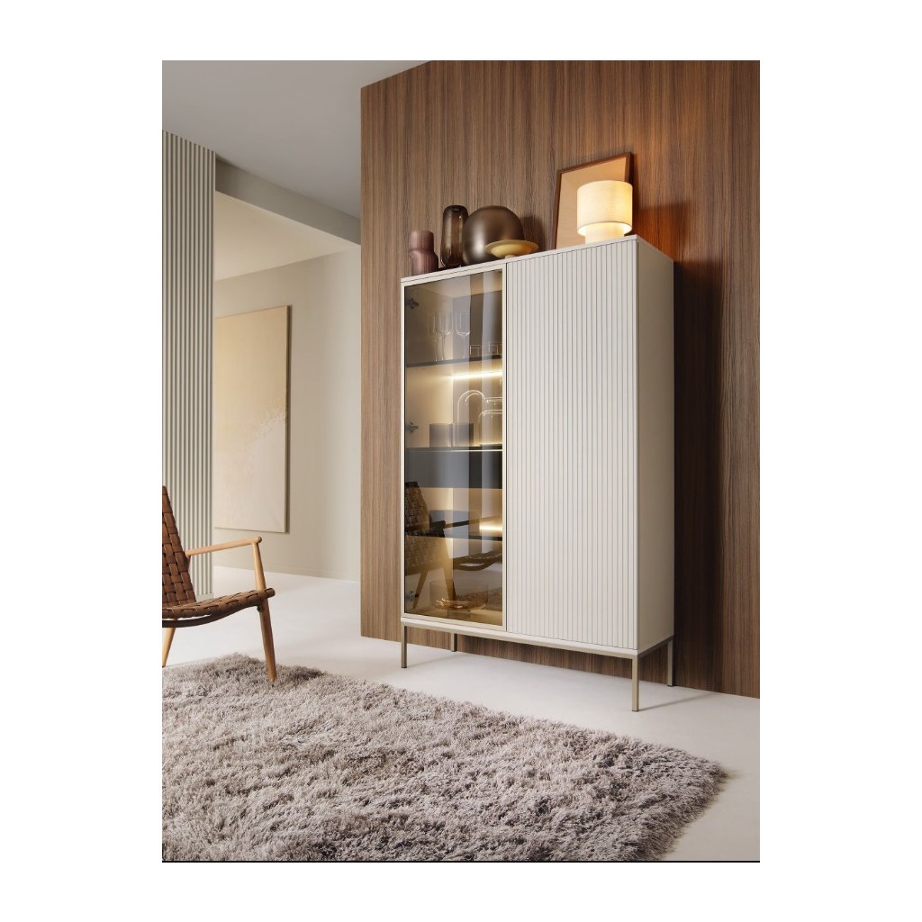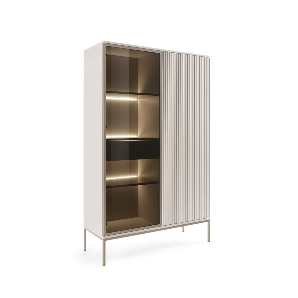 Ak hľadáte modernú, kvalitnú a funkčnú zostavu do obývačky, vitrína INTENSO WTSZ104 je tou správnou voľbou. Elegantné farebné prevedenie cashmere dodáva interiéru jemnosť, štýl a nadčasový vzhľad. Vitrína je postavená na vysokých kovových nohách, ktoré jej dodávajú ľahkosť a vzdušnosť, pričom zároveň umožňujú jednoduché čistenie priestoru pod nábytkom. Lamelové detaily na dvierkach oživujú celkový dizajn a vnášajú do priestoru moderný a sofistikovaný prvok. Presklená časť s integrovaným LED osvetlením vytvára príjemnú atmosféru a elegantne zvýrazňuje charakter vitríny. Vysoká vitrína má dvoje dvierka, z ktorých jedny sú presklené, a do presklenej časti je možné umiestniť zásuvku – ideálne riešenie pre praktické aj estetické usporiadanie úložného priestoru. O komfortné používanie sa stará moderný systém PUSH TO OPEN, ktorý umožňuje jednoduché otváranie bez úchytiek a podčiarkuje čistý, minimalistický dizajn nábytku.