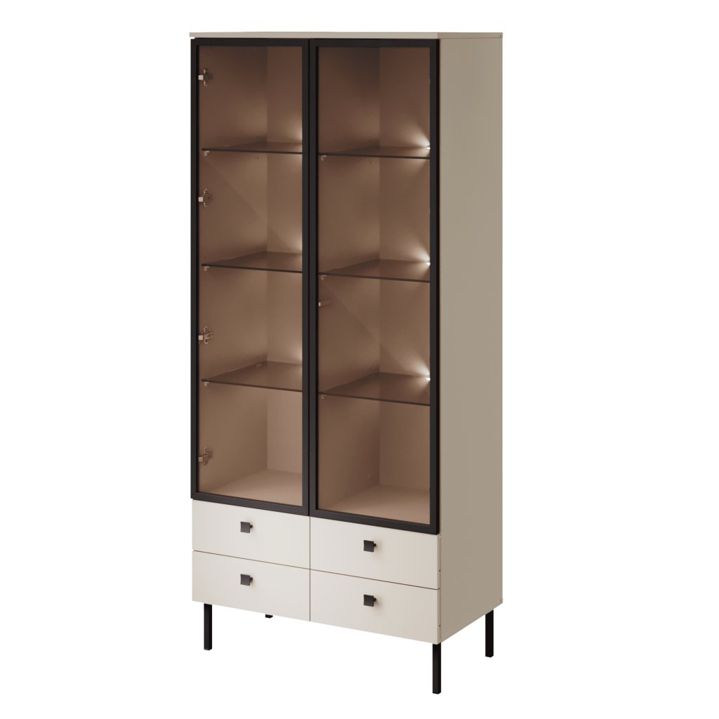 Vitrína je vyrobená z kvalitného laminátu s hrúbkou 16 mm, ktorý je známy svojou vysokou odolnosťou voči poškriabaniu, vlhkosti aj bežnému opotrebovaniu. Laminát poskytuje stabilnú a pevnu konštrukciu, zároveň však umožňuje precízne spracovanie elegantných detailov. Dvierka sú vyrobené z kvalitného skla, ktoré dodáva vitríne ľahkosť a moderný charakter. Vyššie kovové nohy ju odľahčujú. Osvetlenie políc sa zapája pomocou priloženého zdroja do zásuvky.
