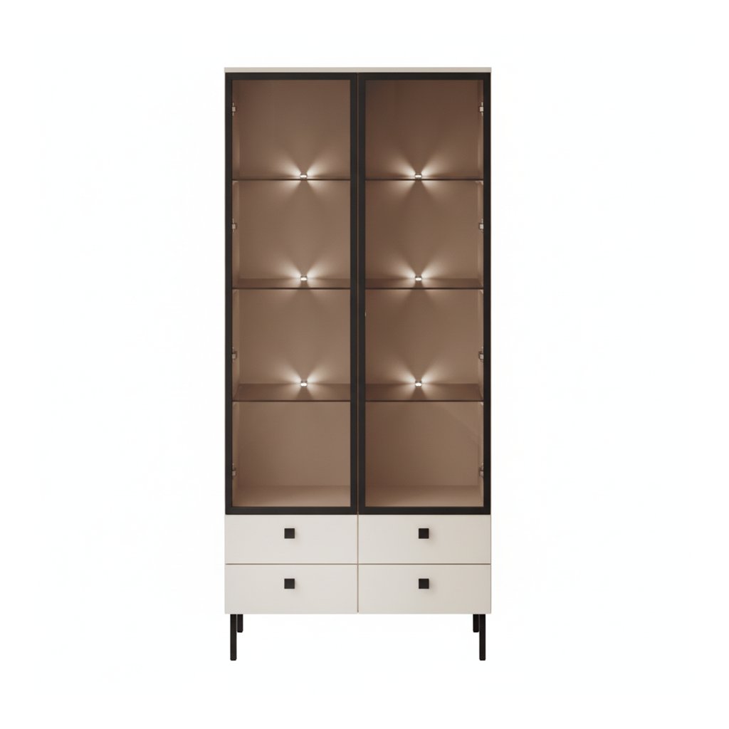 Predstavujeme vám modernú dizajnovú vitrínu KISS, ktorá spája čisté línie, luxusné prevedenie a praktickú funkčnosť. Je ideálna do obývačky, jedálne či reprezentatívnych priestorov, kde vynikne jej nadčasový vzhľad a precízne remeselné spracovanie. Vitrína ponúka kombináciu sklenených dvierok s jemným tmavým rámovaním, ktoré pôsobia mimoriadne elegantne a zvýrazňujú vystavené predmety. Integrované vnútorné osvetlenie vytvára príjemnú atmosféru a robí z vitríny štýlový dizajnový prvok. Dizajnová vitrína KISS je originálny kúsok, ktorý pozdvihne charakter vášho priestoru.
