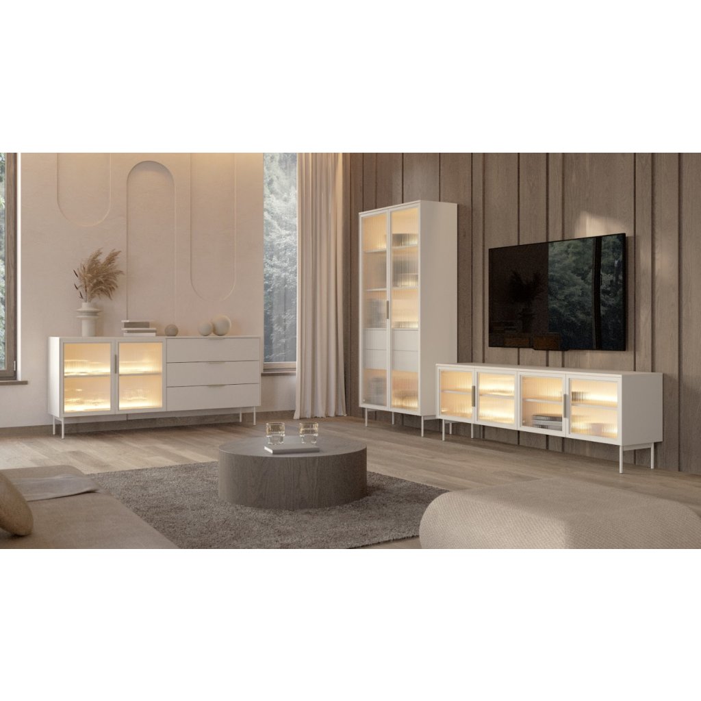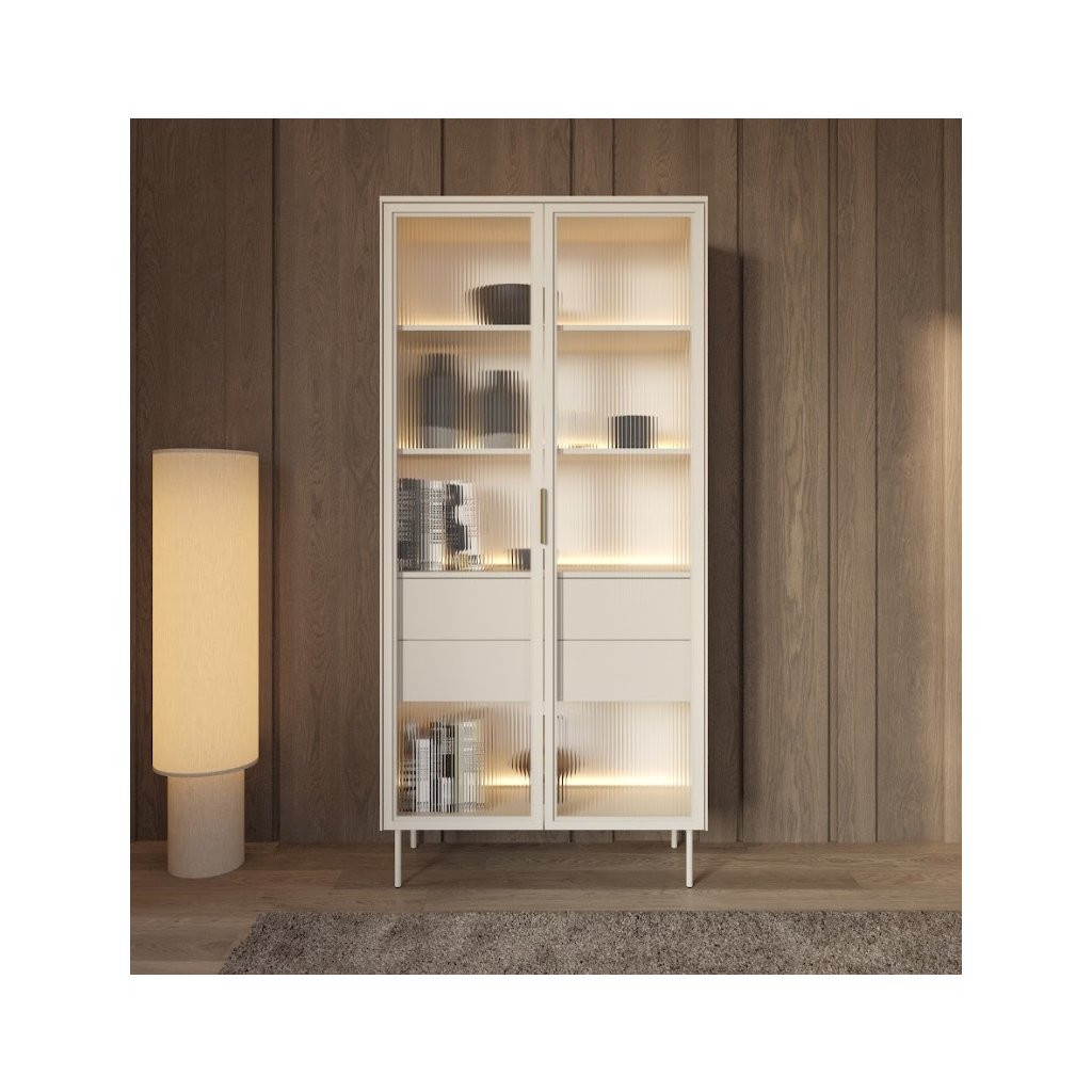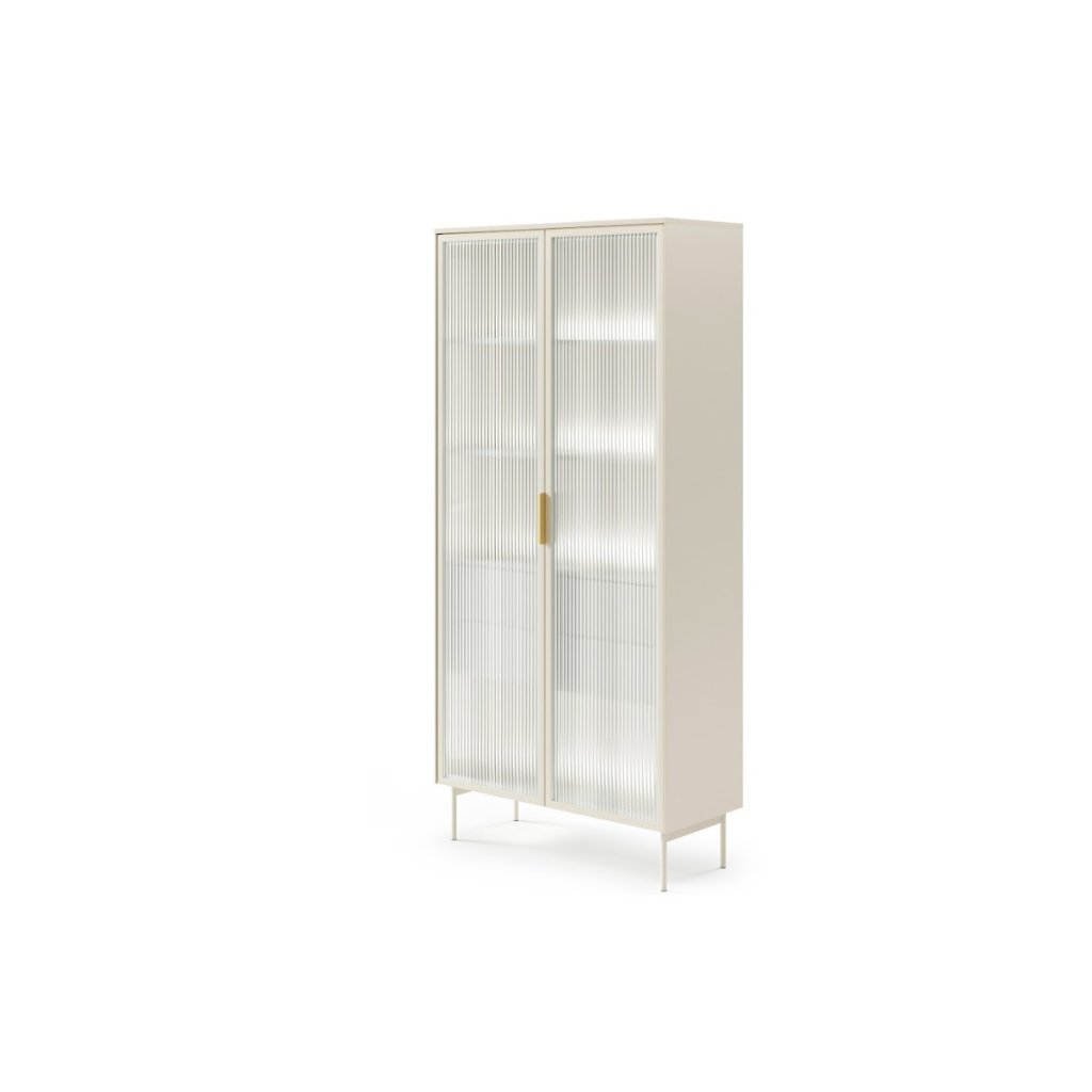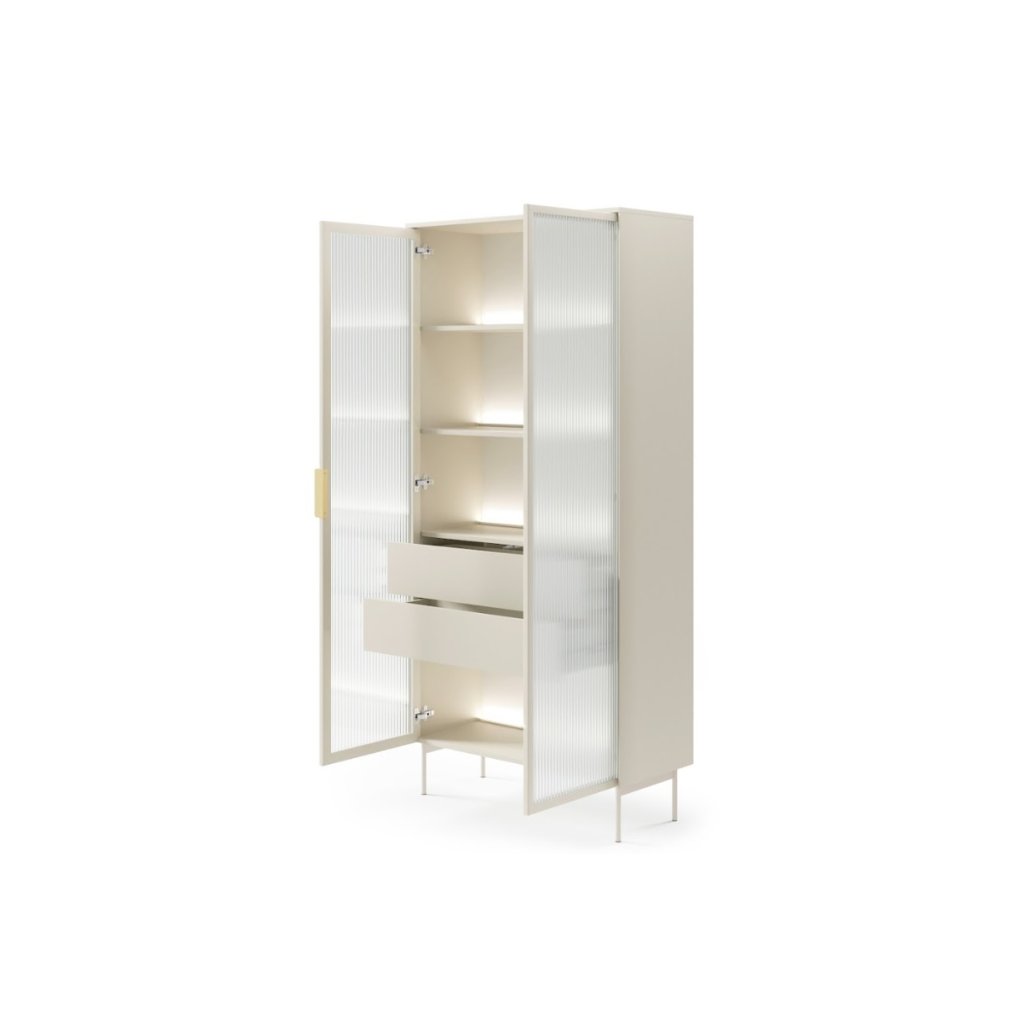 Vitrína NAIRE 2D2S je elegantným doplnkom moderného interiéru v jemnom a nerušivom odtieni cashmere, doplnená o štýlové zlaté úchytky, ktoré jej dodávajú nádych luxusu a sofistikovanosti. Vysoké nohy vo farbe cashmere zabezpečujú ľahký a vzdušný vzhľad, ktorý vynikne v každom priestore. Súčasťou vitríny je integrované LED osvetlenie v svetlej bielej farbe, ktoré podčiarkuje jej moderný dizajn a vytvára útulnú atmosféru. Vitrína je dvojdverová, vybavená praktickými policami a zásuvkami, ktoré ponúkajú dostatok úložného priestoru. Moderný bezúchytkový systém otvárania push-to-open zabezpečuje pohodlné a elegantné používanie bez potreby klasických úchytiek.