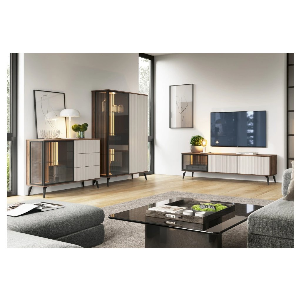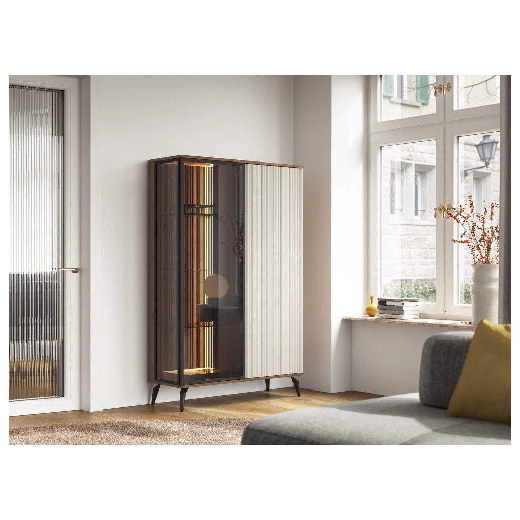 Vitrína je vyrobená z kvalitného a odolného materiálu, ktorý zaručuje dlhú životnosť a nenáročnú údržbu. ABS hrany spoľahlivo chránia nábytok pred mechanickým poškodením a zvyšujú jeho odolnosť. Dvierka majú profilované čelá z MDF dosky s hrúbkou 18 mm, ktoré vitríne dodávajú pevnosť, eleganciu a jedinečný vzhľad.