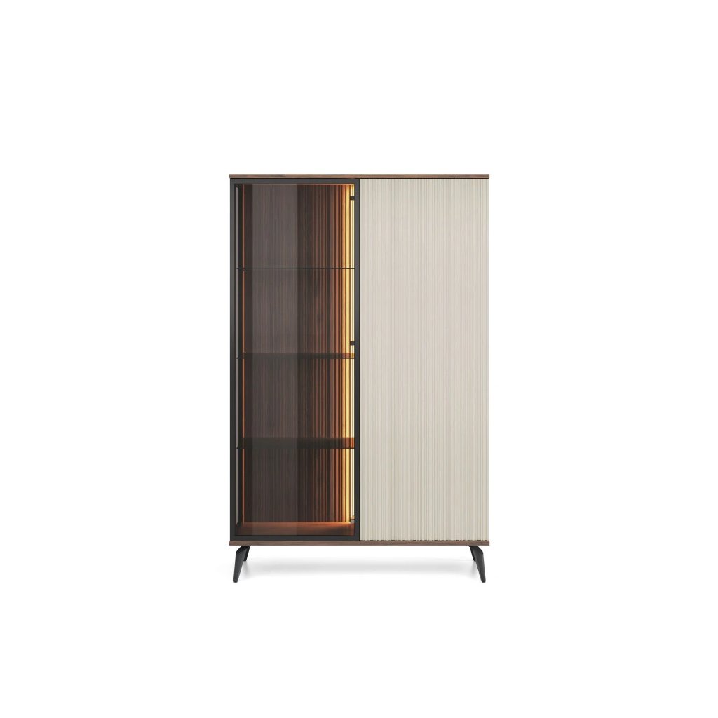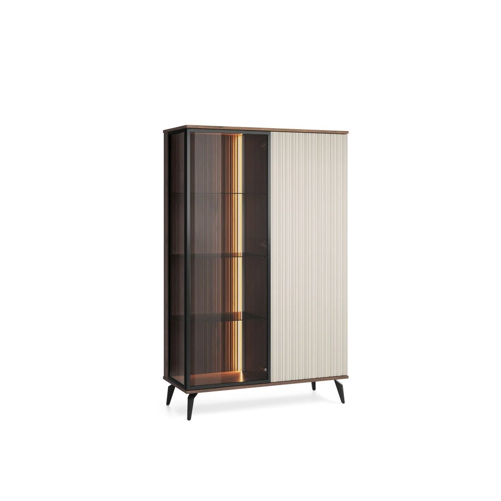 Vitrína PURO WT-103 je exkluzívnym kúskom nábytku, ktorý spája moderný dizajn, funkčnosť a eleganciu. Vyrobená je z kvalitného a odolného materiálu s ABS hranami, ktoré zaručujú dlhú životnosť a ochranu pred poškodením. Pre vitrínu sú typické čisté a nadčasové línie doplnené o sklenenú vitrínku s diskrétnym LED osvetlením v teplej bielej farbe, ktoré vytvára útulnú atmosféru a zvýrazňuje vystavené dekorácie. Zaujme aj elegantné prevedenie dvierok so systémom PUSH TO OPEN, ktorý umožňuje pohodlné otváranie bez úchytiek a podčiarkuje jej minimalistický vzhľad. Kovové nožičky dodávajú vitríne stabilitu, ľahkosť a umožňujú jednoduché čistenie priestoru pod nábytkom – ideálne aj pre robotický vysávač.