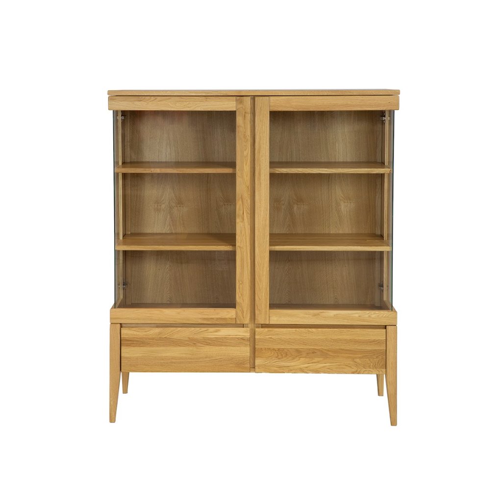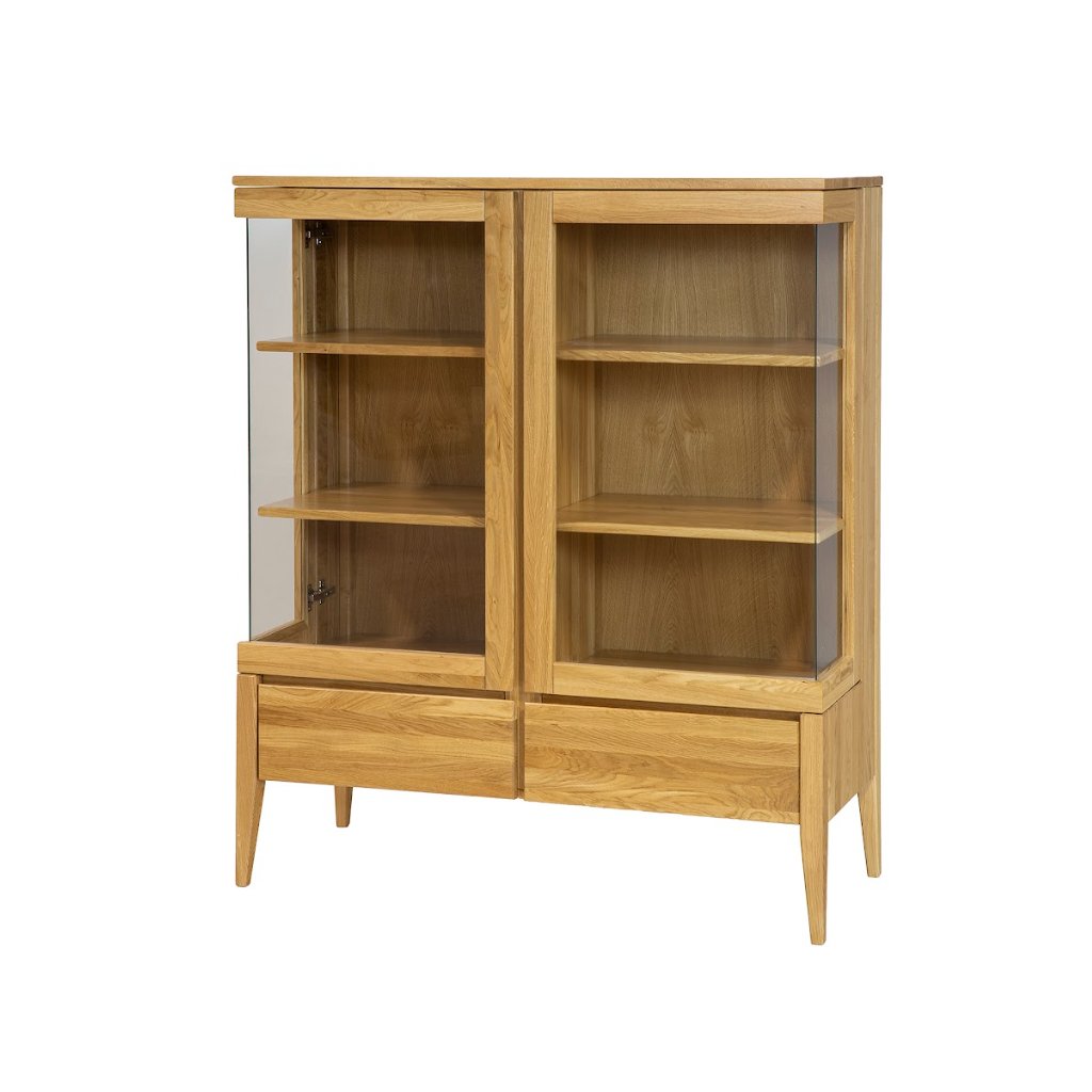 Elegantná vitrína RETRO KW336 je vyrobená z masívneho dubového dreva a doplnená kvalitným čírym sklom, vďaka čomu kombinuje prírodný charakter s ľahkosťou moderného dizajnu. V hornej časti sa nachádzajú štyri otvorené police ukryté za presklenými dvierkami, ideálne na vystavenie porcelánu, skla, kníh alebo dekorácií. Spodná časť ponúka praktické zásuvky na uskladnenie predmetov, ktoré chcete mať po ruke, no nie na očiach. Čisté línie a bezúchytkové riešenie zvýrazňujú prirodzenú textúru dubového dreva. Štíhle nohy dodávajú vitríne vizuálnu ľahkosť, vďaka čomu sa krásne hodí aj do menších priestorov.