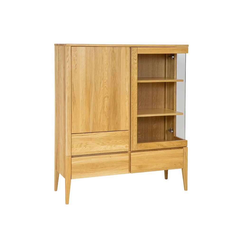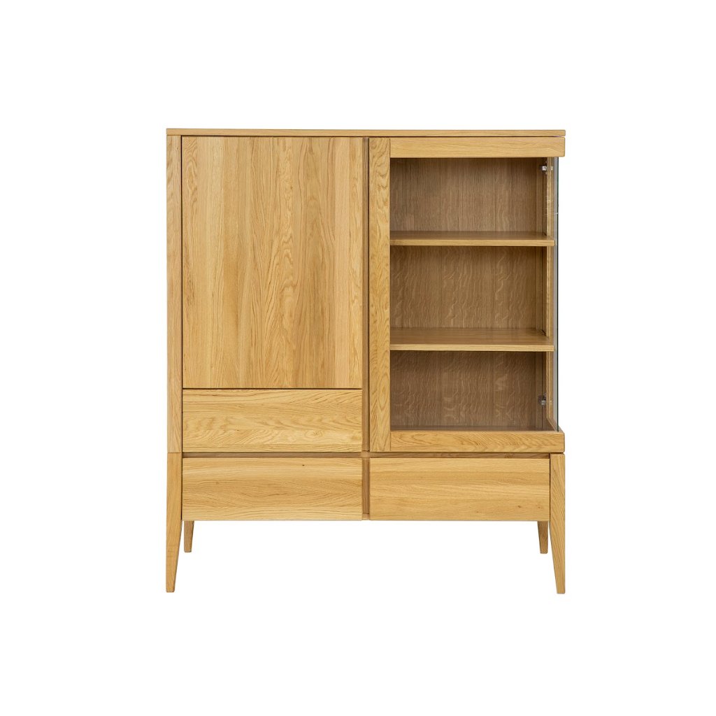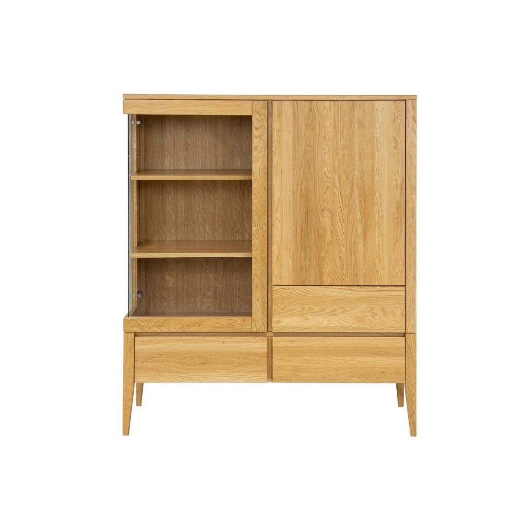 Dizajnová vitrína RETRO KW337 z masívneho dubového dreva spája elegantné presklené police s uzatvoreným úložným priestorom. Model je dostupný v konfigurácii ľavá aj pravá – môžete si tak zvoliť orientáciu presklenej časti podľa dispozície interiéru. Čisté línie a bezúchytkové riešenie zvýrazňujú prirodzenú textúru dubového dreva. Štíhle nohy dodávajú vitríne vizuálnu ľahkosť, vďaka čomu sa krásne hodí aj do menších priestorov.