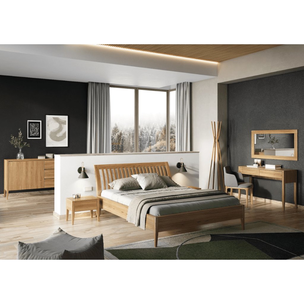 Dubové drevo má charakteristickú jemnú kresbu a teplý zlatohnedý odtieň, ktorý pôsobí prirodzene a útulne. Každý kus dubu je originálny – textúra, letokruhy a prirodzené farebné prechody dodávajú nábytku jedinečný vzhľad.Materiál dub prírodný je jedným z najkvalitnejších a najžiadanejších druhov dreva, používaných pri výrobe nábytku. Vyznačuje sa vysokou tvrdosťou, pevnosťou a odolnosťou, vďaka čomu je mimoriadne trvácny a dlhodobo si zachováva svoj tvar aj pri intenzívnom používaní.