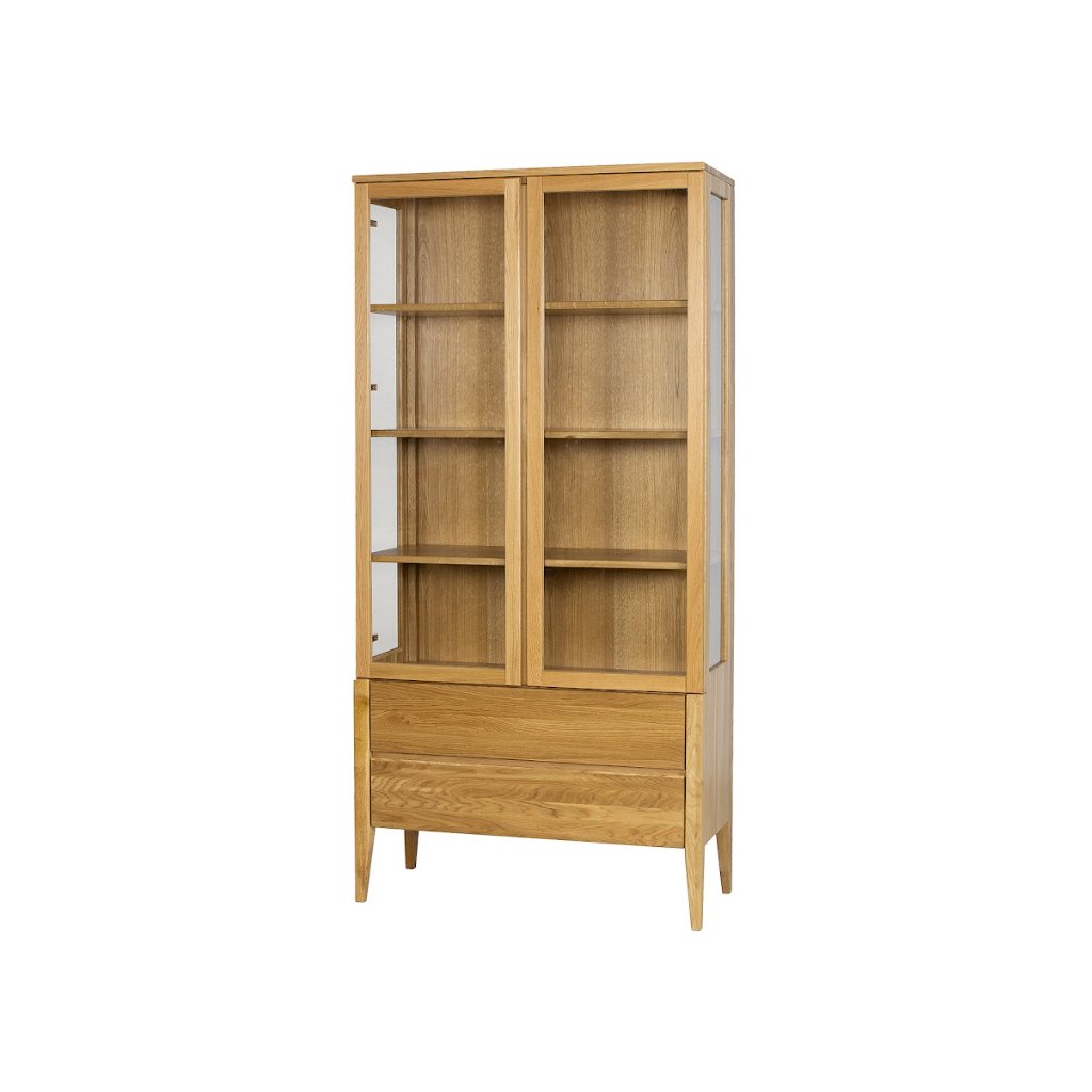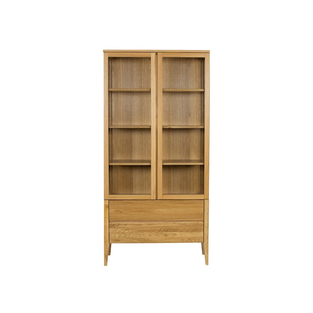 Elegantná vysoká vitrína RETRO KW339 z masívneho dubového dreva je navrhnutá pre tých, ktorí chcú skombinovať estetiku s funkčnosťou. Horná časť obsahuje police za presklenými dvierkami, ideálne na vystavenie porcelánu, skla, kníh či dekorácií. Spodná časť je vybavená dvoma zásuvkami, ktoré ukryjú predmety, ktoré nemajú byť na očiach. Vďaka minimalistickému bezúchytkovému riešeniu, olejovanému povrchu a štíhlym nožičkám pôsobí vitrína ľahko a moderne aj napriek svojej výške.