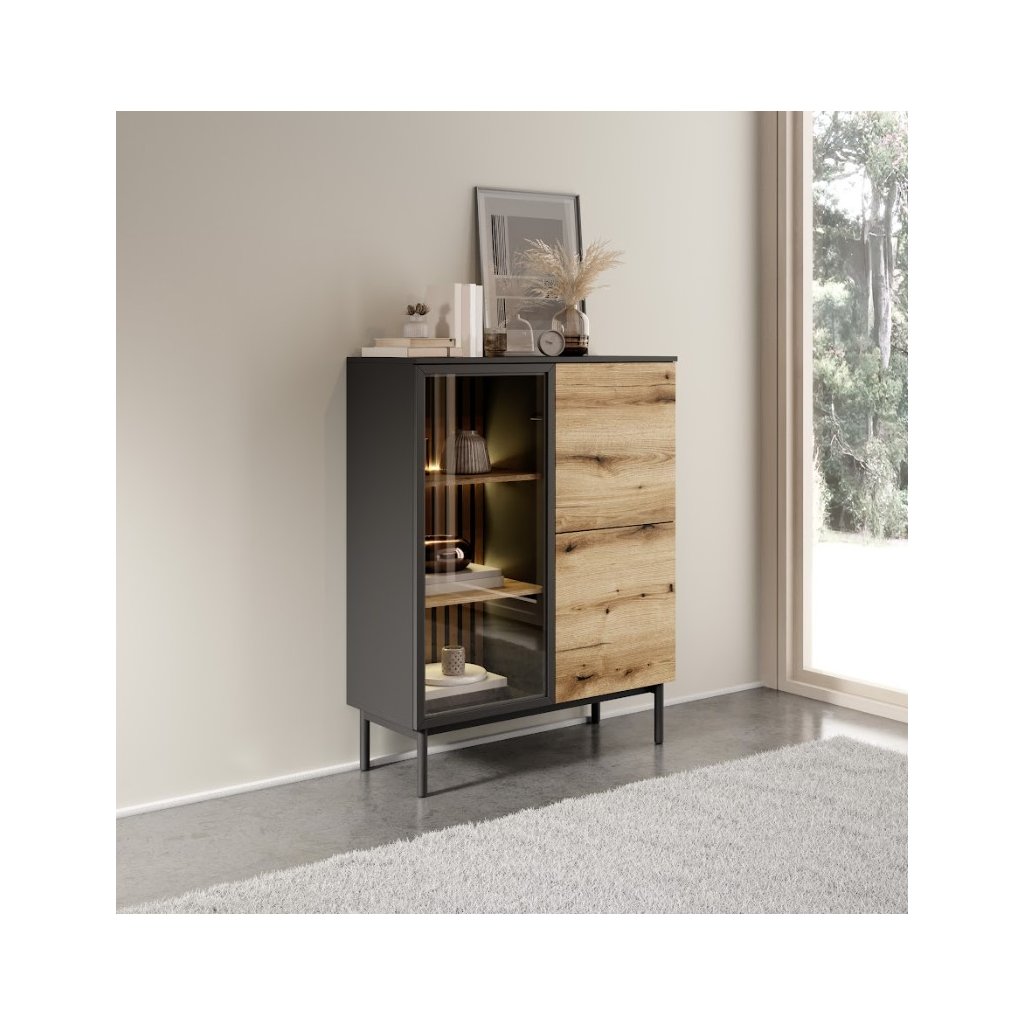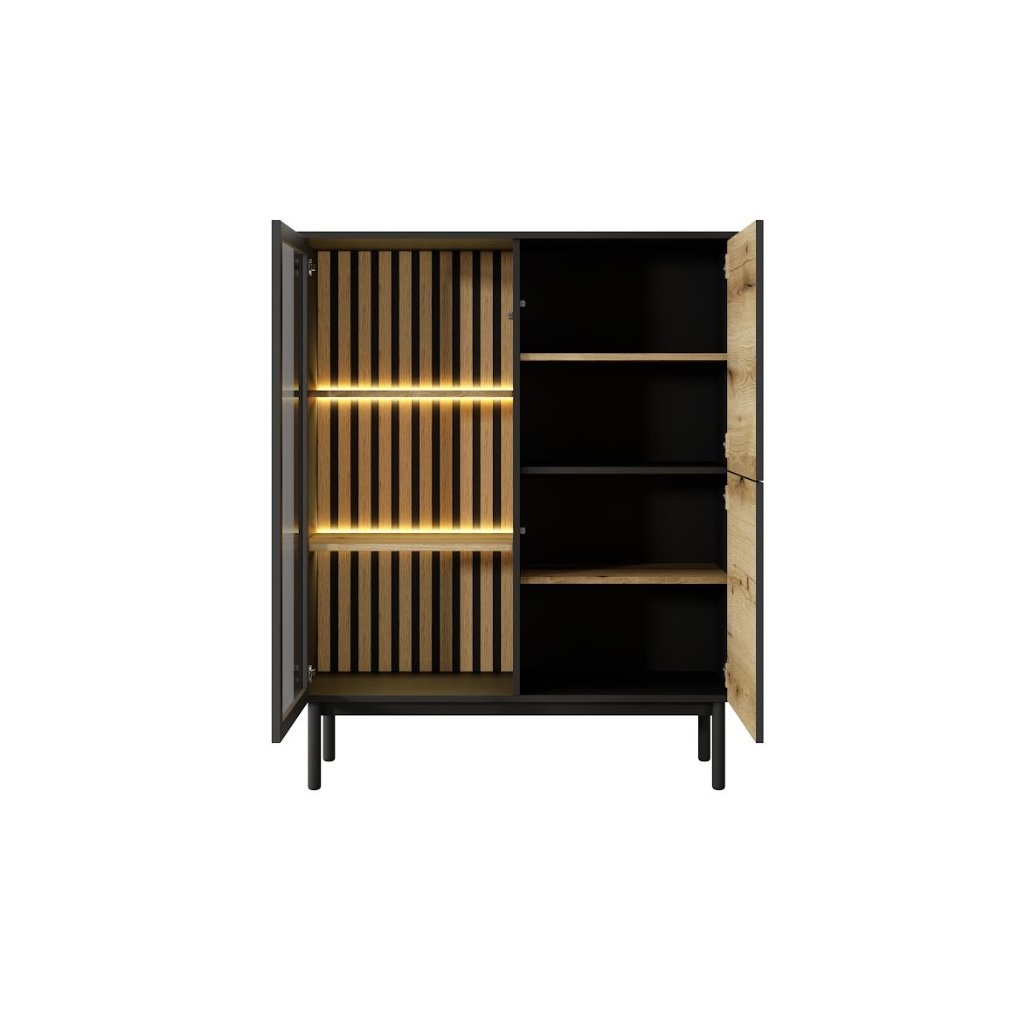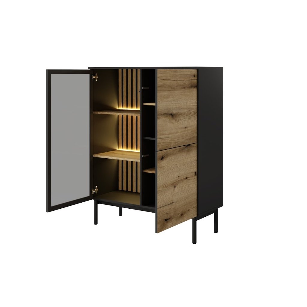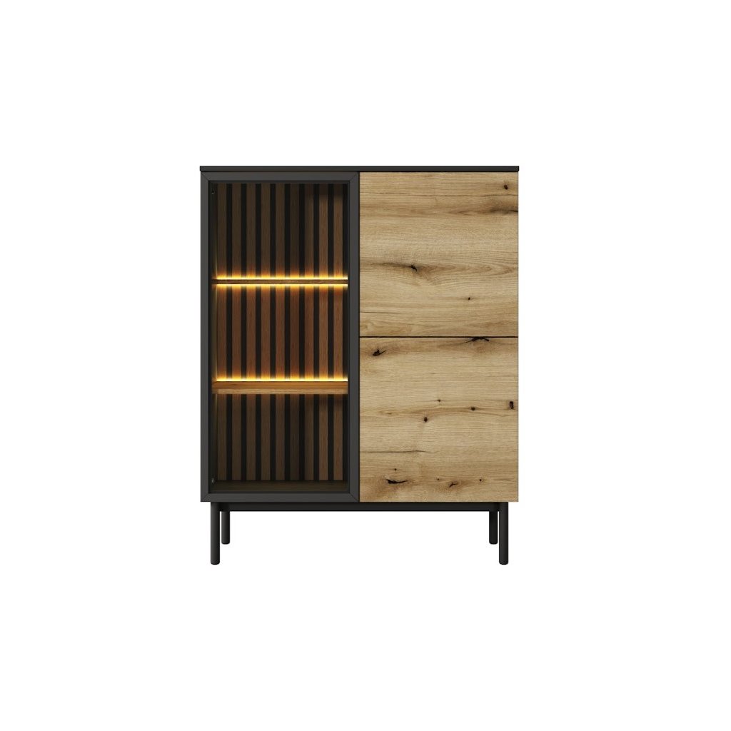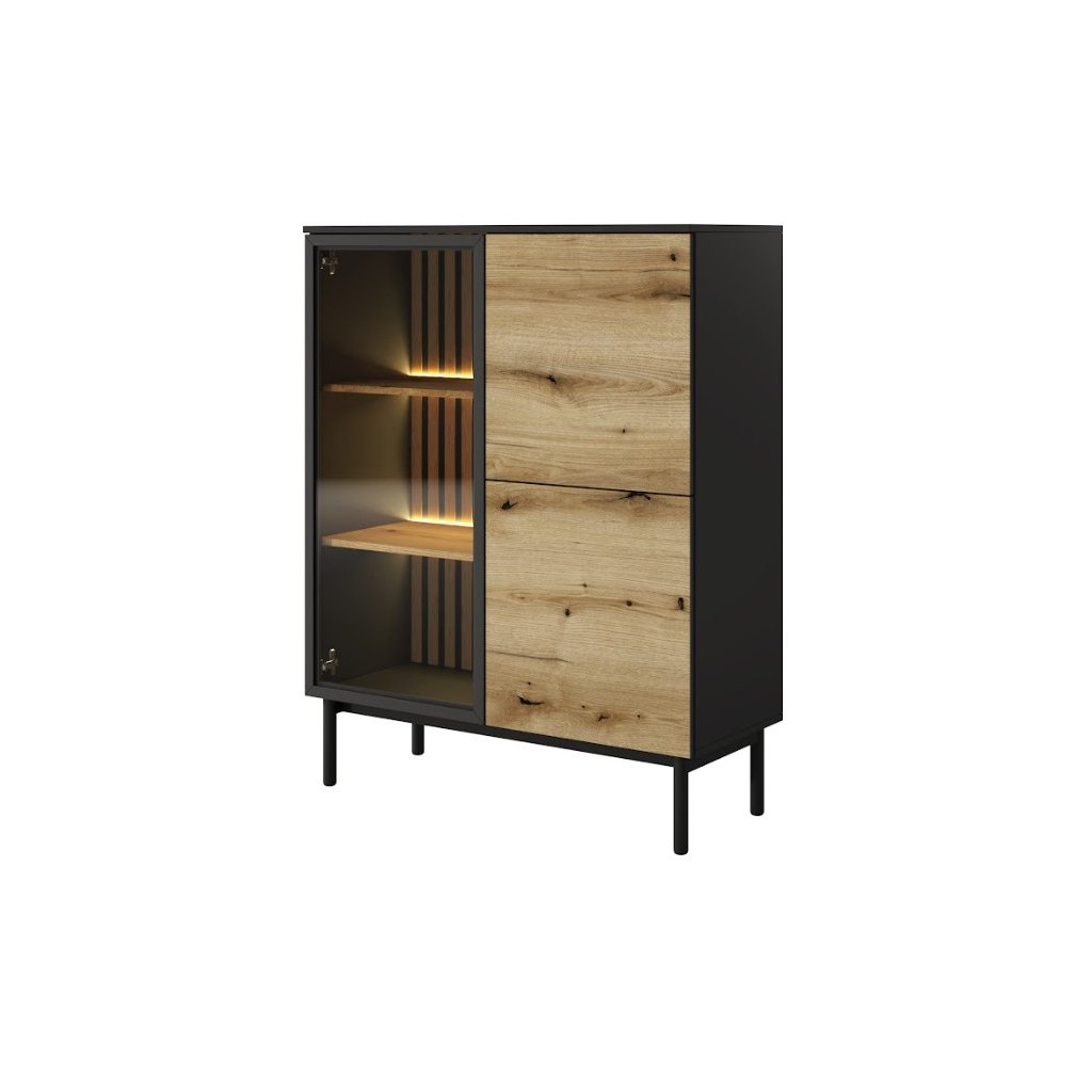 Nízka vitrína TONG spája prírodný dub s elegantnou čiernou farbou, ktorú podčiarkuje teplé LED osvetlenie a lamely umiestnené za tónovaným sklom, vytvárajúce útulnú a príjemnú atmosféru. Namiesto klasických rukovätí je vybavená moderným systémom push-to-open, ktorý umožňuje pohodlné otváranie dotykom. Táto štýlová vitrína je ideálna pre tých, ktorí hľadajú originálny dizajn, jedinečný štýl a praktické riešenie pre svoj interiér.