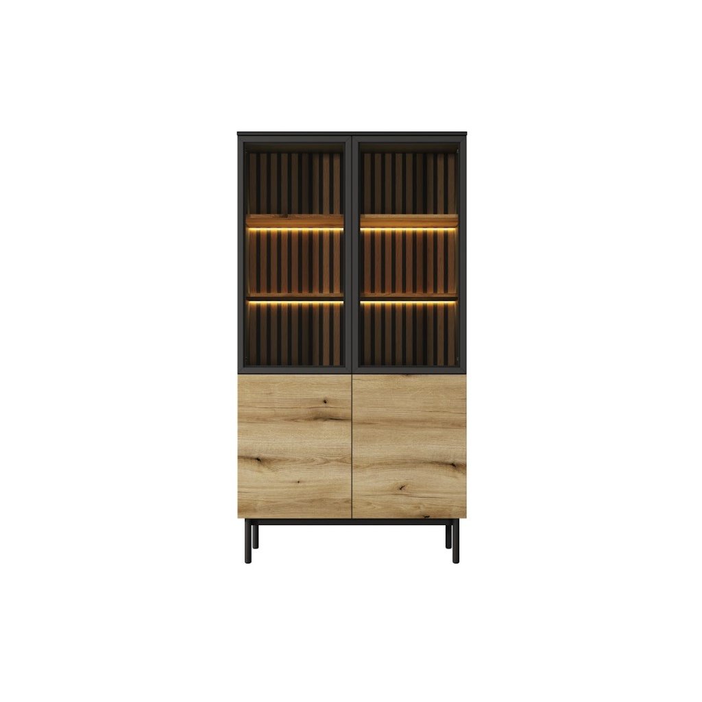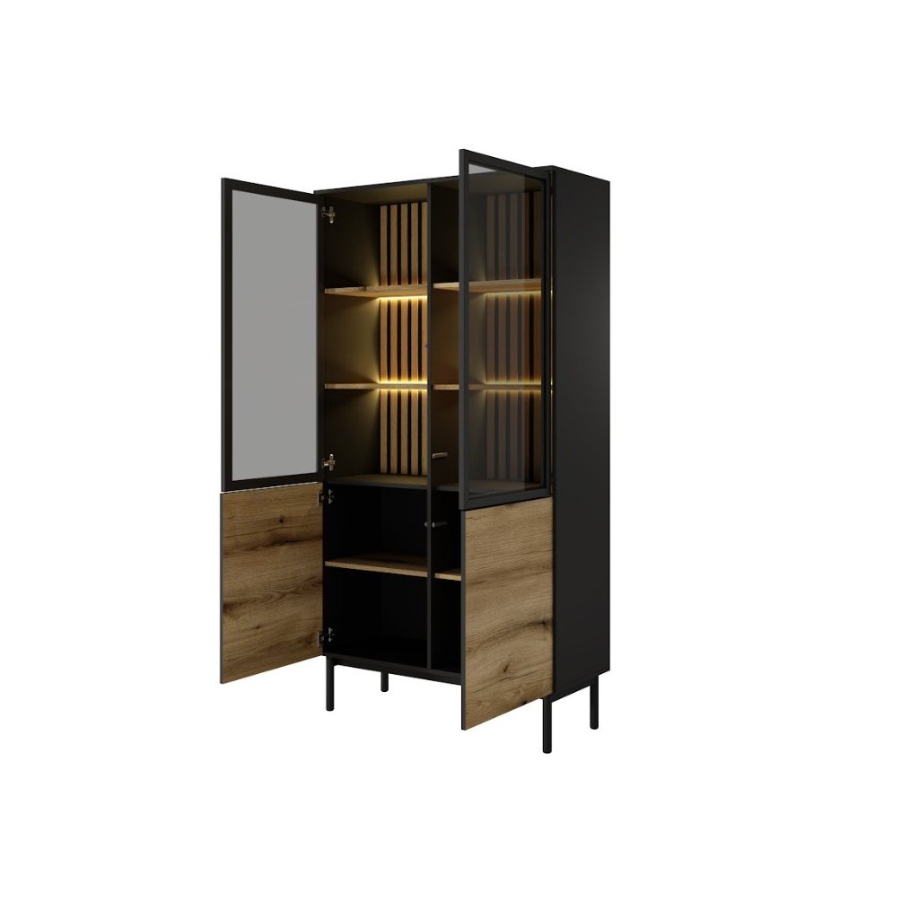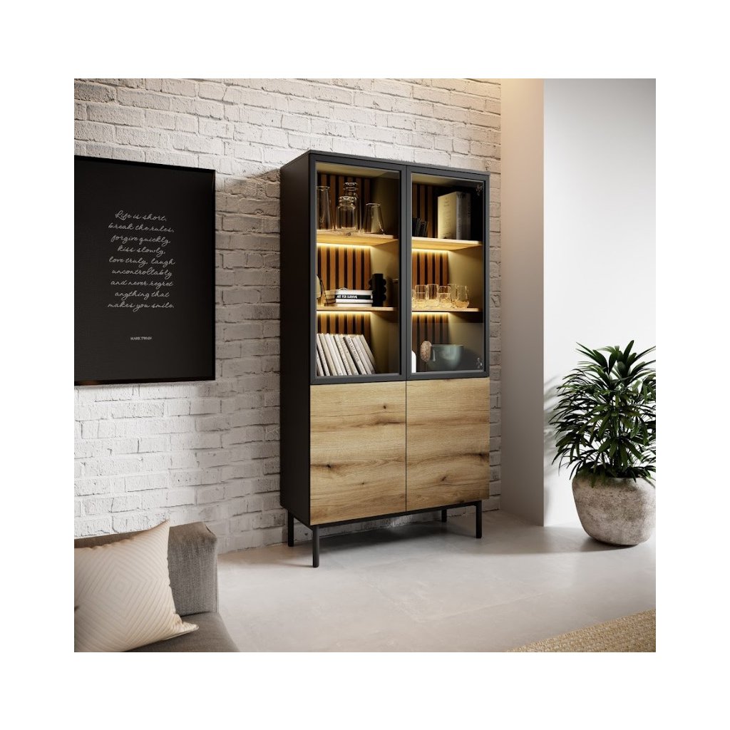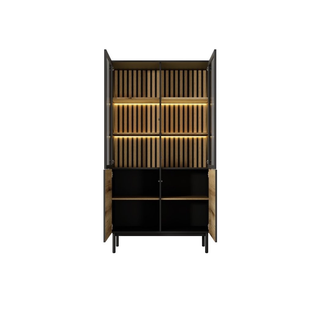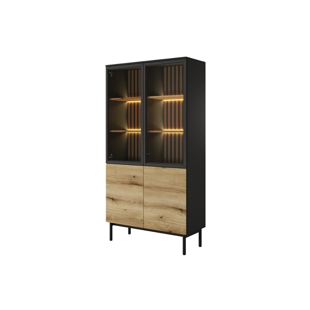 Vysoká vitrína TONG spája prírodný dub s elegantnou čiernou farbou, ktorú dopĺňa teplé LED osvetlenie a lamely umiestnené za tónovaným sklom – spolu vytvárajú útulnú, modernú atmosféru. Namiesto klasických rukovätí je vybavená praktickým systémom push-to-open, ktorý umožňuje pohodlné otváranie dotykom. Táto dizajnová vitrína je ideálna pre tých, ktorí si potrpia na originalitu, štýl a funkčnosť. Inšpirujte sa našou kolekciou krásnych a praktických vitrín, ktoré dodajú vášmu domovu jedinečný charakter.