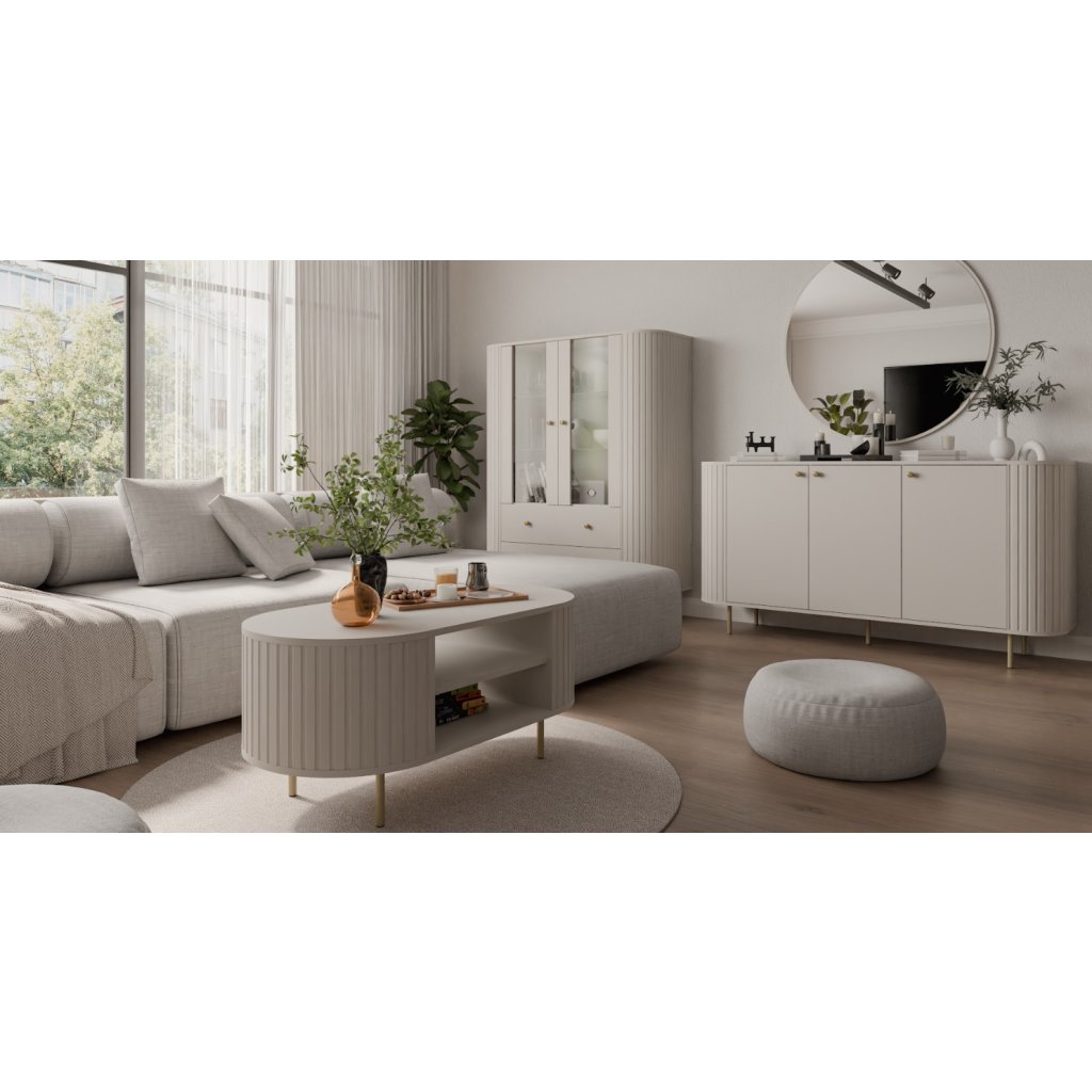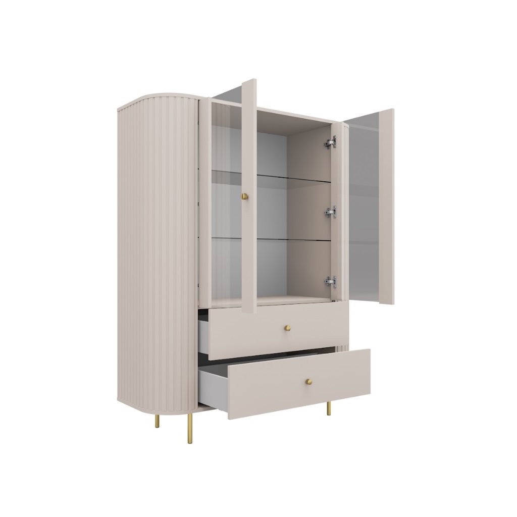 Kolekcia VAOLIA prináša minimalistický štýl, ktorý podčiarkujú precízne frézované detaily a dodávajú interiéru elegantný, moderný rozmer. Tlmené, zemité odtiene pieskovo béžovej farby sú harmonicky doplnené zlatými akcentmi, ktoré jemne kontrastujú so svetlou paletou a vytvárajú sofistikovaný vzhľad. Vitrína VAOLIA 2F2S je navrhnutá ako dvojdverový model s dvomi priestrannými zásuvkami, ktoré ponúkajú praktický a prehľadný úložný priestor. Kovové nohy a úchytky v zlatom prevedení dodávajú vitríne ľahkosť, vzdušnosť a podčiarkujú jej elegantný charakter bez toho, aby ju opticky zaťažovali.