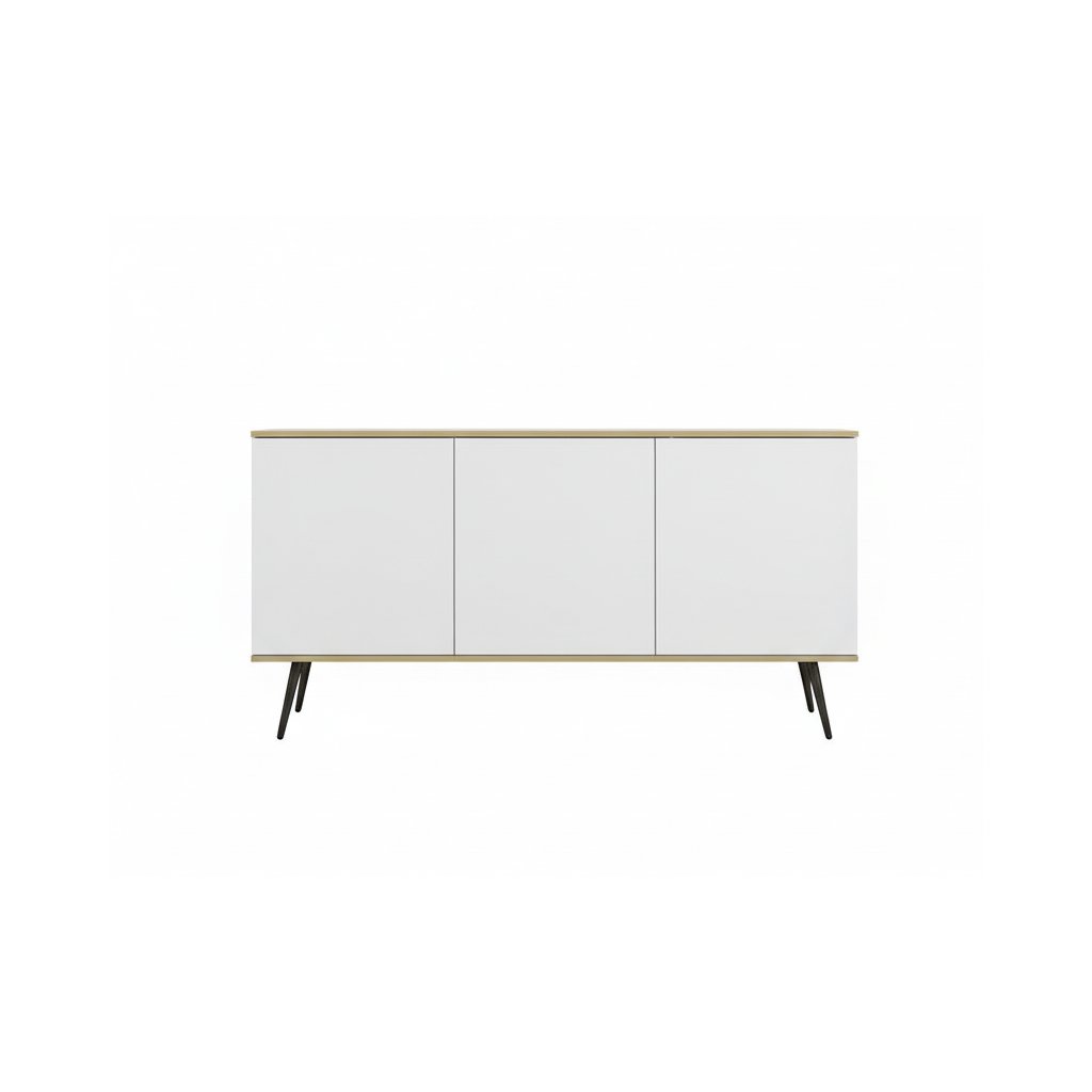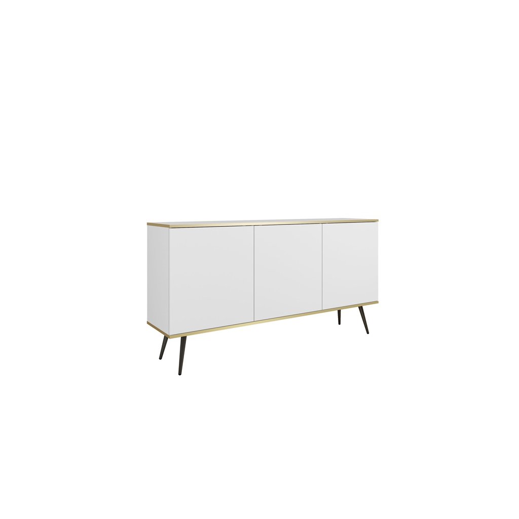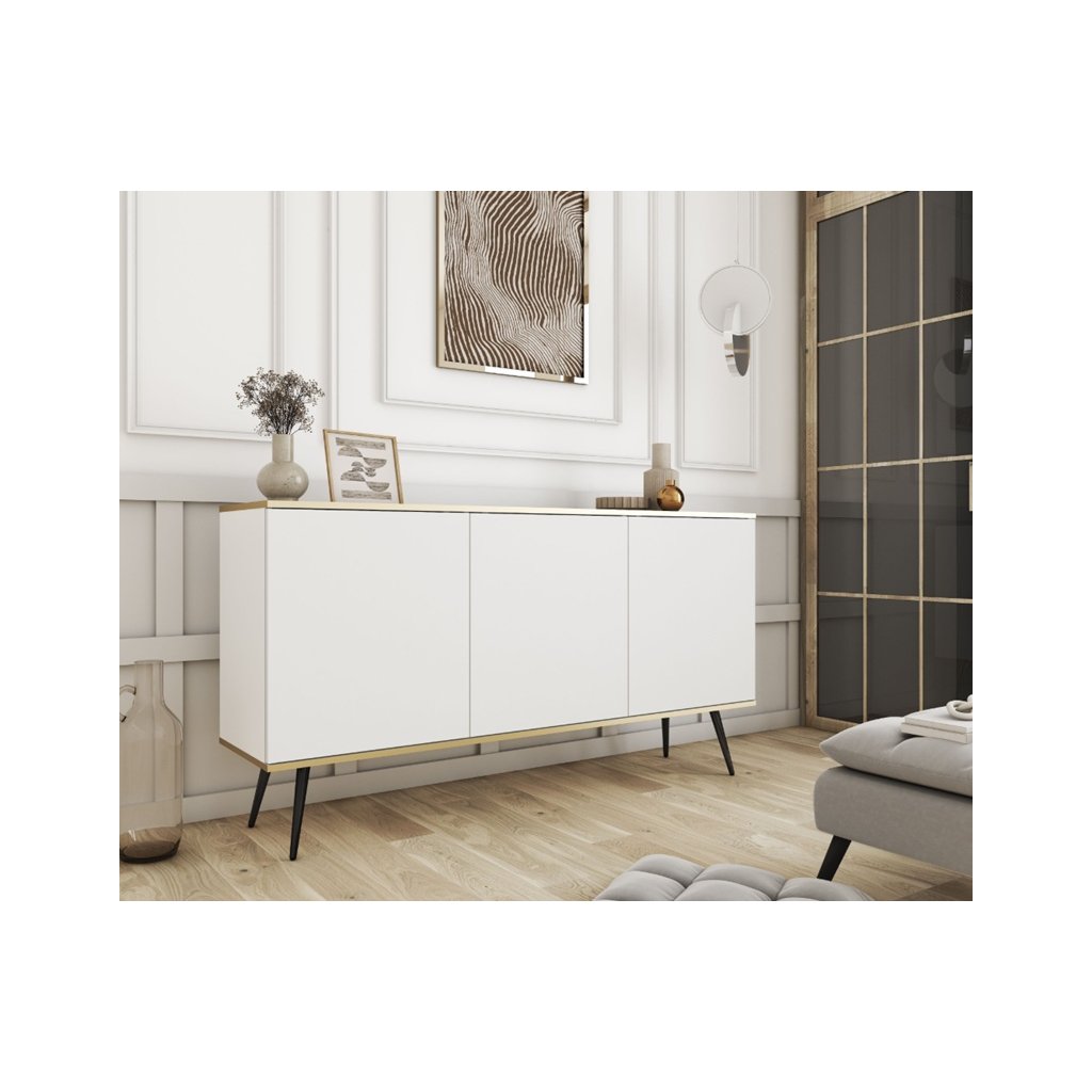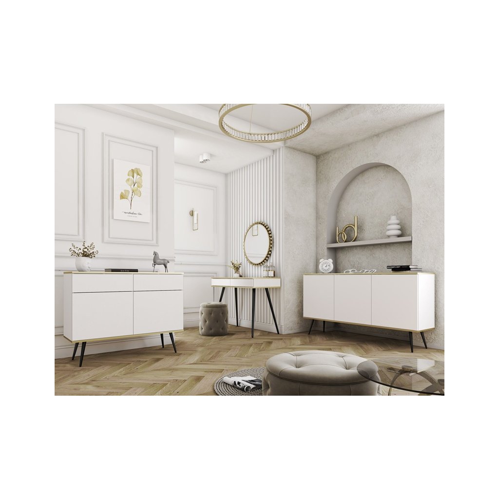 Priestranná komoda BIJOU K-160 v praktickej bielej farbe s elegantnými čiernymi nožičkami dodá interiéru moderný a vzdušný vzhľad. Jej univerzálna farebná kombinácia sa ľahko zladí s akýmkoľvek štýlom či farebným prevedením nábytku. Trojdverové prevedenie so zabudovanými policami ponúka dostatok úložného priestoru na uskladnenie vašich vecí. Zvoľte si elegantné a nadčasové riešenie pre obývačku alebo spálňu.