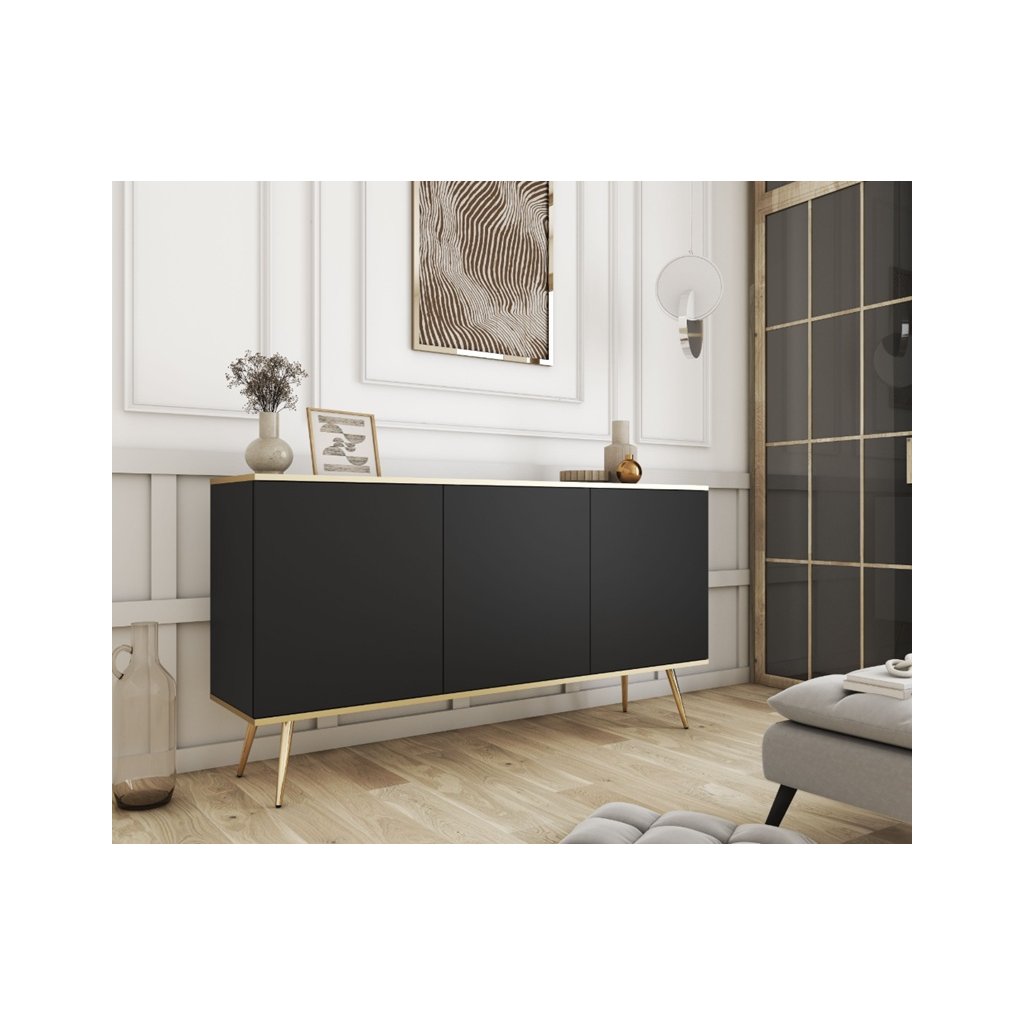 Priestranná čierna komoda BIJOU K-160 so zlatými nožičkami dodáva interiéru nádych výnimočnosti a luxusu. Zlatý dekoračný pásik elegantne dopĺňa jej celkový vzhľad a vytvára harmonický kontrast s tmavým prevedením. Táto štýlová kombinácia sa dokonale hodí do moderných aj klasických interiérov. Trojdverové prevedenie s tromi policami ponúka dostatok priestoru na uloženie všetkých potrebných vecí. Vneste do svojej obývačky či spálne elegantný a nadčasový prvok, ktorý zaujme svojím dizajnom aj praktickosťou.