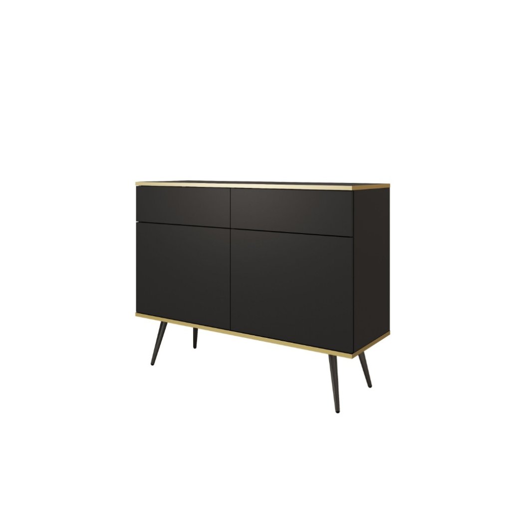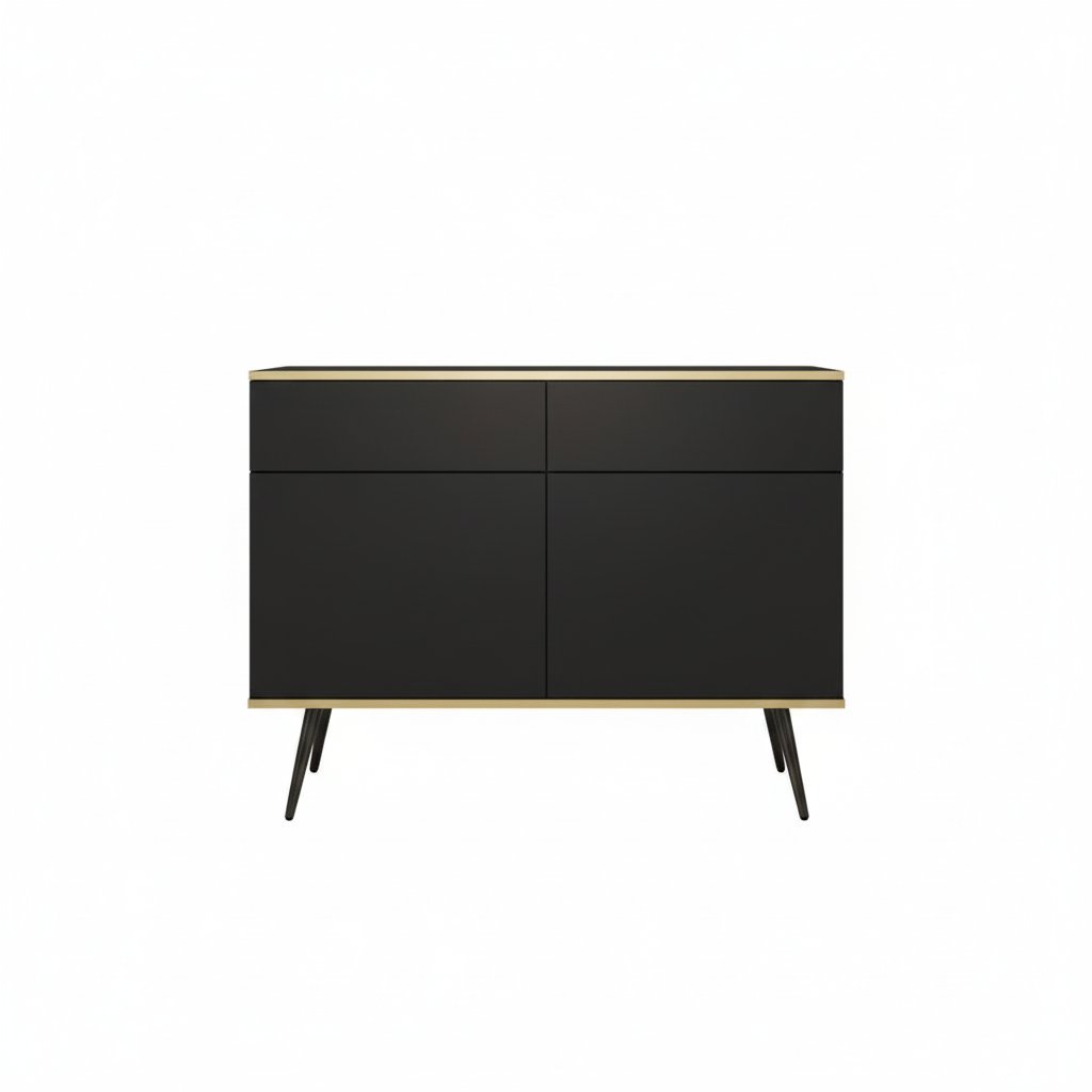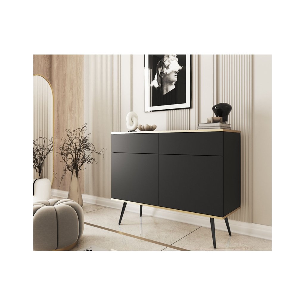 Priestranná komoda BIJOU KSZ-107 v elegantnej čiernej farbe s čiernymi vysokými nožičkami pôsobí moderne a dodáva interiéru nádych luxusu. Zlatý dekoračný pásik jej dodáva nadčasový charakter a dokonale ladí s rôznymi štýlmi zariadenia aj farebnými doplnkami. Táto dvojdverová komoda s dvomi zásuvkami s plným výsuvom ponúka dostatok úložného priestoru pre vaše veci. Doplňte svoju obývačku či spálňu o štýlový a elegantný prvok, ktorý spája moderný dizajn s praktickosťou.
