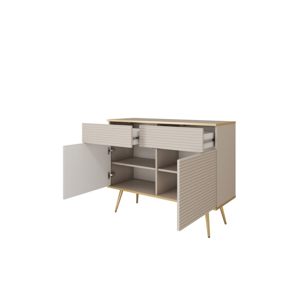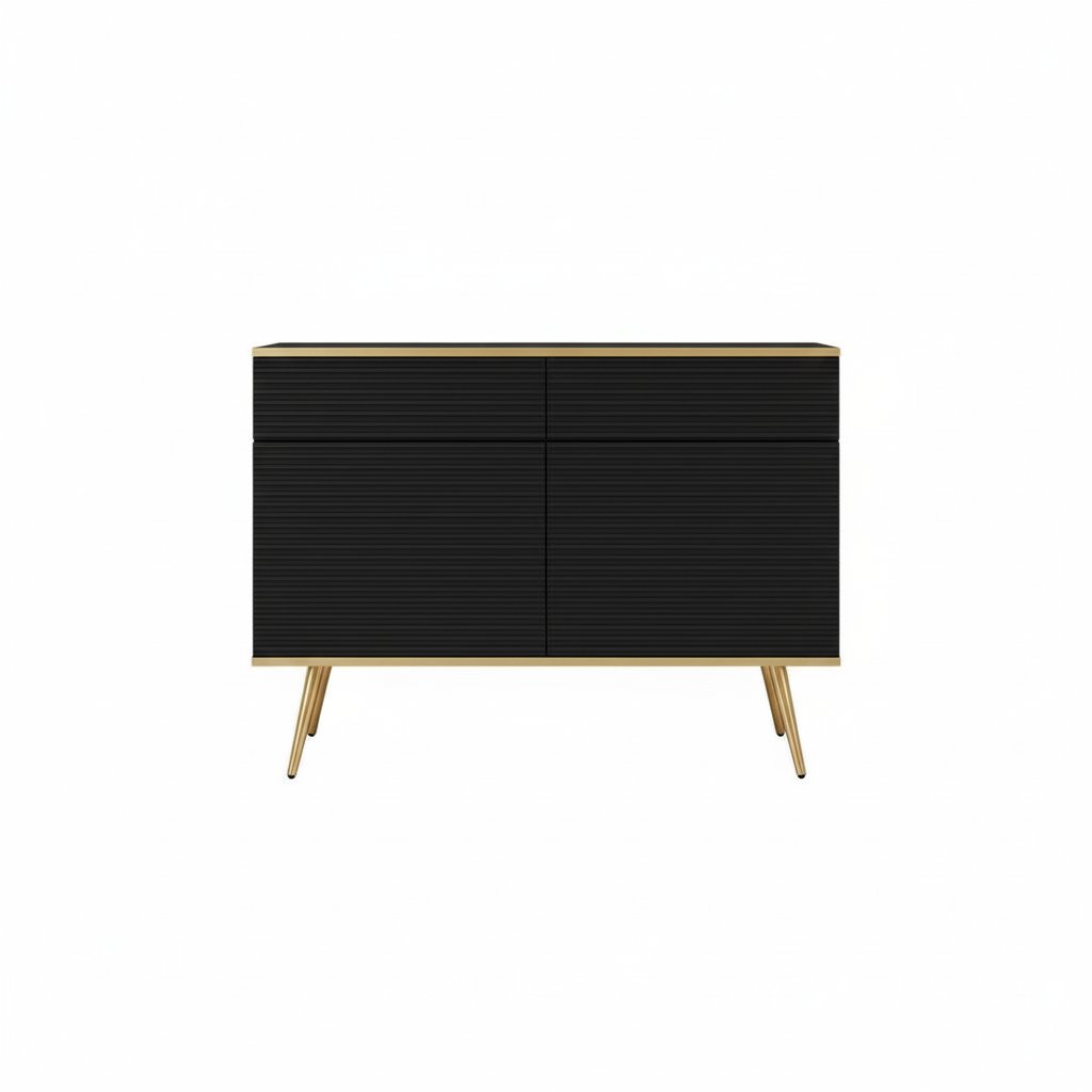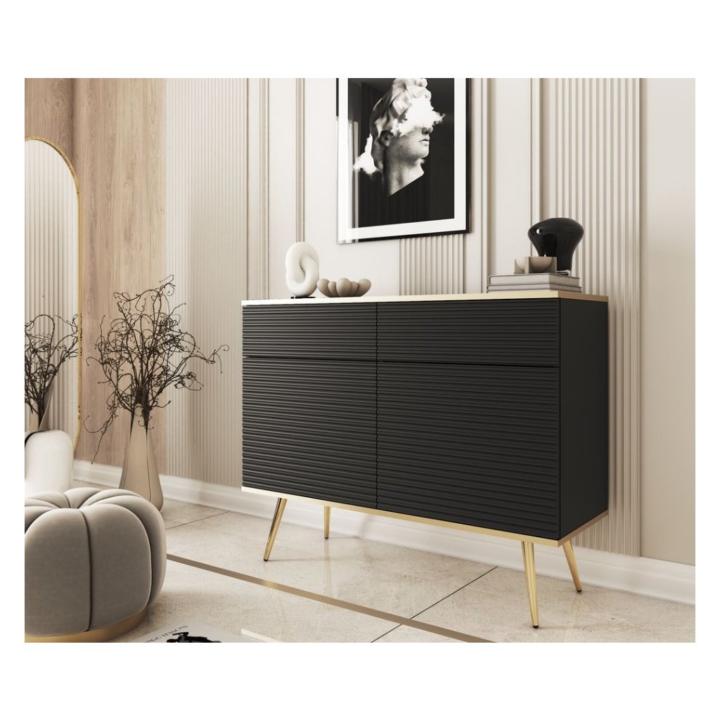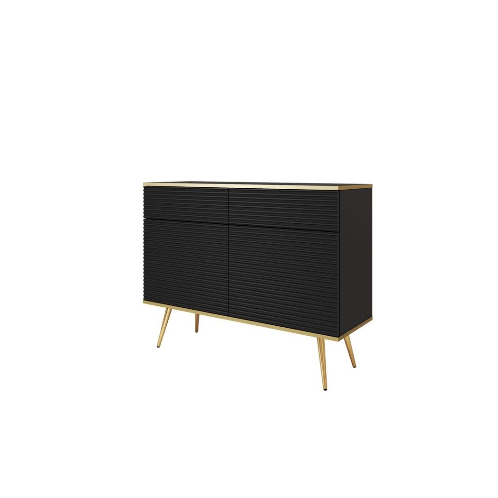Elegantná komoda BIJOU K-107 v čiernej farbe so zlatými nožičkami vnáša do interiéru pocit luxusu, harmónie a štýlu. Vďaka svojmu univerzálnemu dizajnu sa dokonale hodí k rôznym štýlom a farebným kombináciám zariadenia. Dvierka so systémom „push to open“ umožňujú tiché a pohodlné otváranie jednoduchým dotykom. Frézované čelá so zlatým lemovaním podčiarkujú elegantný charakter komody a dodávajú jej jedinečný vzhľad. Priestranné vnútorné usporiadanie so zásuvkami a dvierkami poskytuje dostatok úložného priestoru, vďaka čomu je táto komoda ideálnym spojením praktickosti a nadčasového dizajnu.
