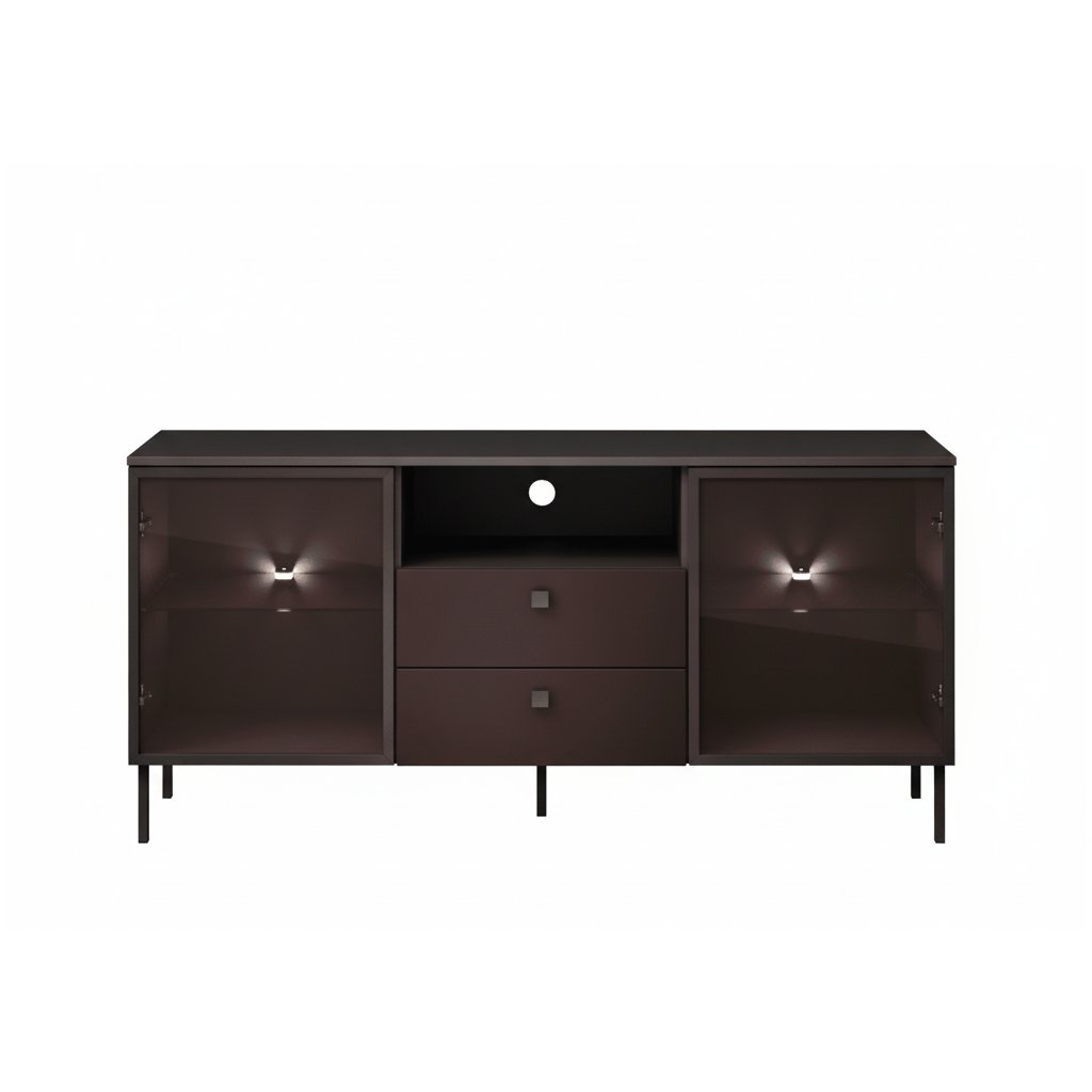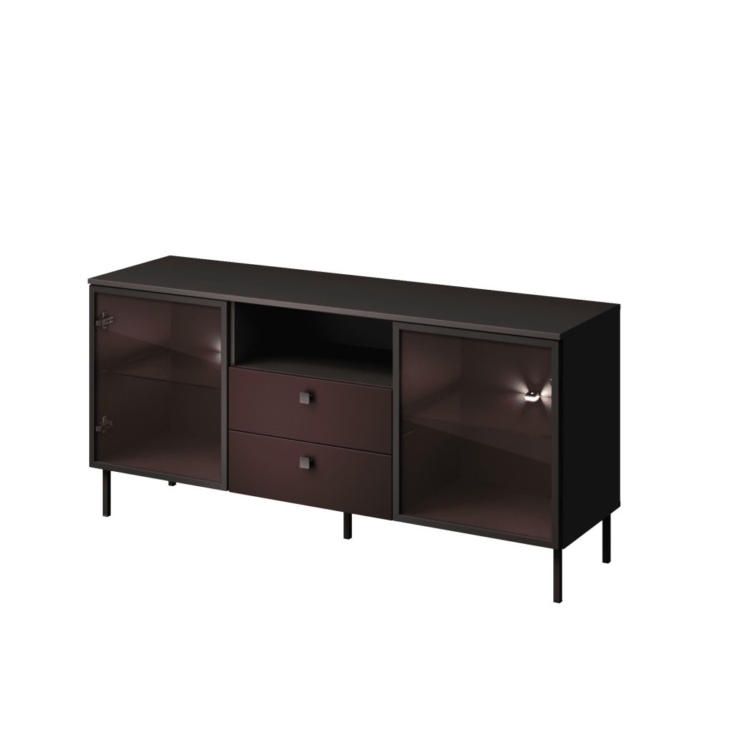 Komoda je vyrobená z kvalitného laminátu s hrúbkou 16 mm, ktorý je známy svojou vysokou odolnosťou voči poškriabaniu, vlhkosti aj bežnému opotrebovaniu. Laminát poskytuje stabilnú a pevnu konštrukciu, zároveň však umožňuje precízne spracovanie elegantných detailov. Dvierka sú vyrobené z kvalitného skla, ktoré dodáva komode ľahkosť a moderný charakter. Vyššie kovové nohy komodu odľahčujú. Osvetlenie políc sa zapája pomocou priloženého zdroja do zásuvky.