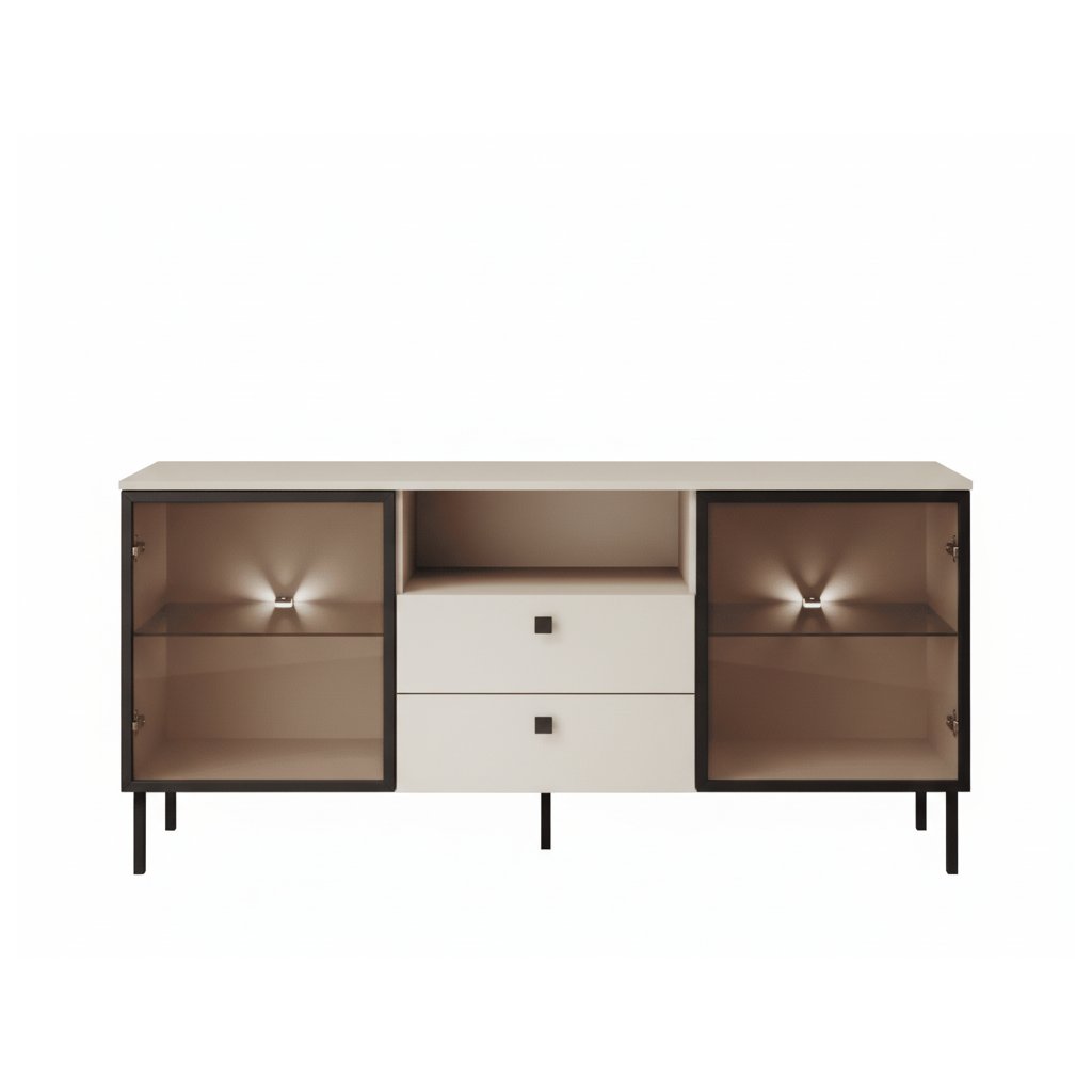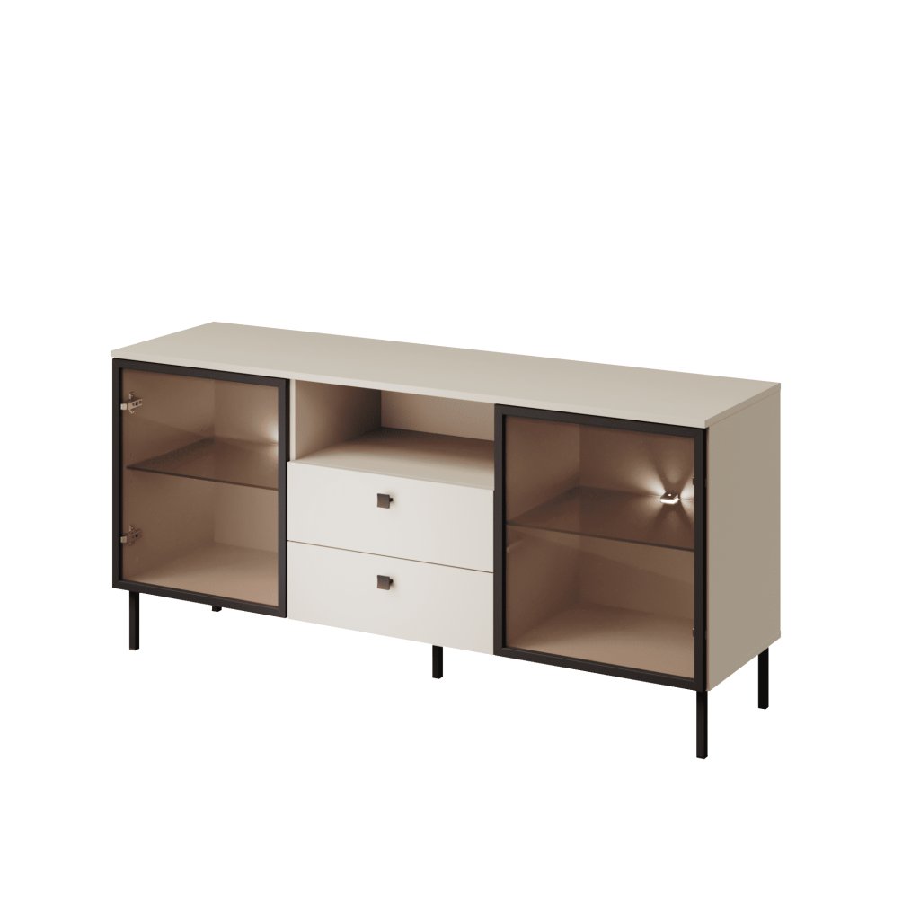 Komoda je vyrobená z kvalitného laminátu s hrúbkou 16 mm, ktorý je známy svojou vysokou odolnosťou voči poškriabaniu, vlhkosti aj bežnému opotrebovaniu. Laminát poskytuje stabilnú a pevnu konštrukciu, zároveň však umožňuje precízne spracovanie elegantných detailov. Dvierka sú vyrobené z kvalitného skla, ktoré dodáva komode ľahkosť a moderný charakter. Vyššie kovové nohy komodu odľahčujú. Osvetlenie políc sa zapája pomocou priloženého zdroja do zásuvky.