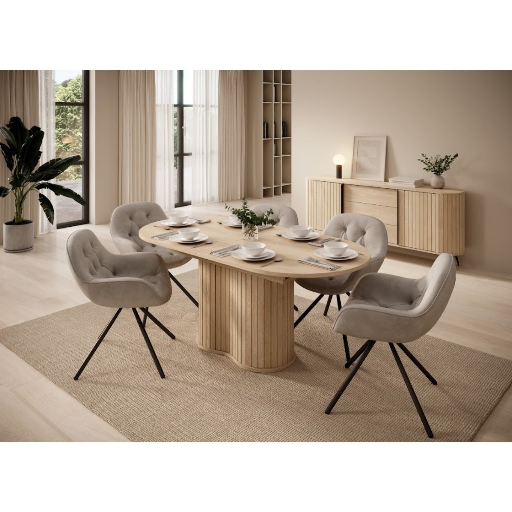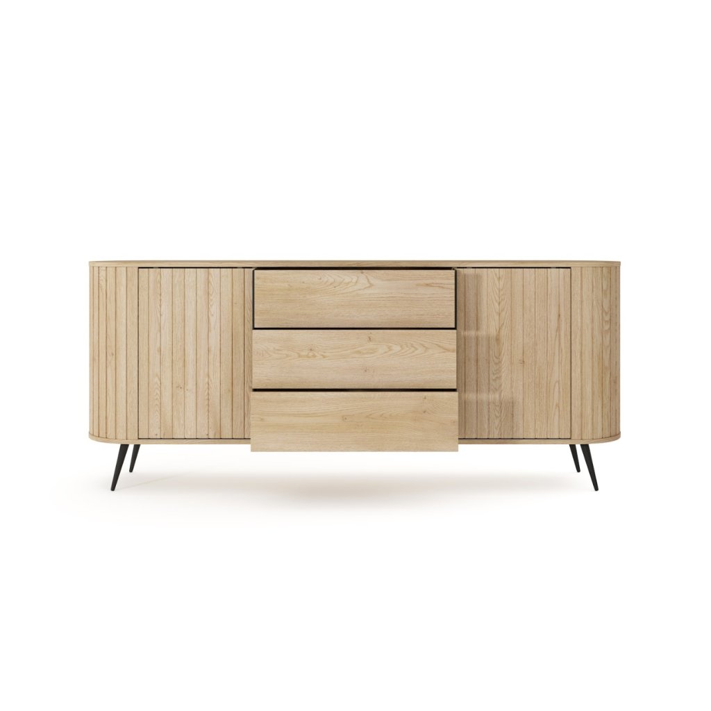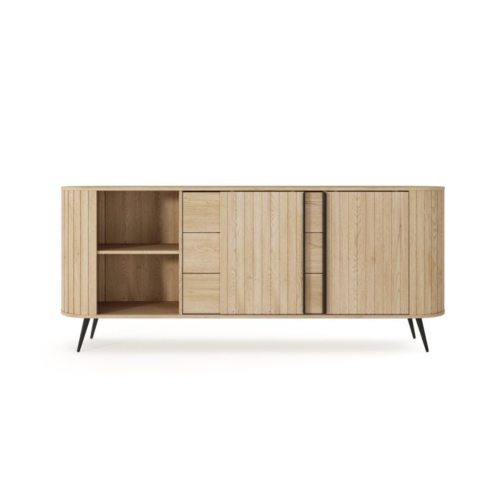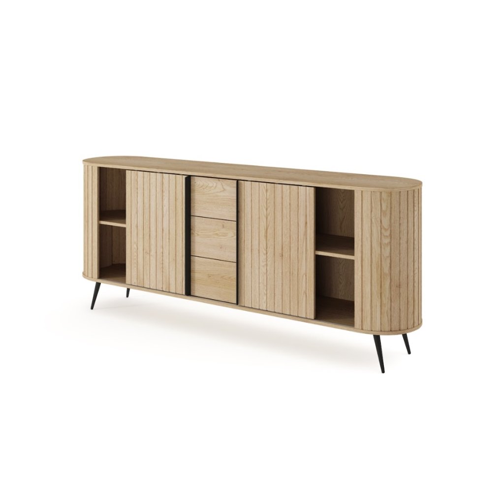 Kolekcia LOVLI spája praktickosť, originalitu a moderný dizajn, vďaka čomu umožňuje vytvoriť výnimočný a harmonicky zladený interiér. Jemné, prirodzené odtiene dubu Cremona dodávajú priestoru sviežosť, teplo a prirodzenú eleganciu. Charakteristickým prvkom tejto kolekcie sú zaoblené boky a drážkované posuvné dvierka, ktoré jej dodávajú nezameniteľný a osobitý štýl. Komoda LOVLI 196 | 2D3S je elegantne doplnená o kovové nohy a čierne úchytky, ktoré podčiarkujú jej moderný vzhľad. Zásuvky s mechanizmom PUSH TO OPEN umožňujú pohodlné a bezúchytkové otváranie, čím zvyšujú komfort používania.