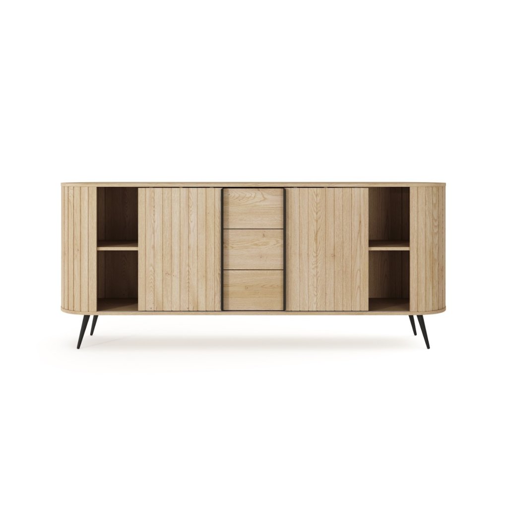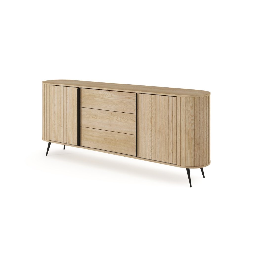 Komoda LOVLI 196 | 2D3S je vyrobená z odolného laminátu s ABS hranami, ktoré poskytujú spoľahlivú ochranu pred poškodením a zaručujú dlhú životnosť nábytku. Charakteristickým prvkom sú posuvné dvierka s drážkovaným vzorom a zaoblené bočné lišty z MDF, ktoré dodávajú komode originálny a elegantný vzhľad. Celkový dizajn dopĺňajú kvalitné kovové nohy a úchytky, vďaka ktorým pôsobí nábytok stabilne a štýlovo zároveň. Údržba je rýchla a jednoduchá – stačí použiť navlhčenú handričku alebo jemný čistiaci prostriedok na nábytok, aby si komoda zachovala svoj dokonalý vzhľad po dlhé roky.