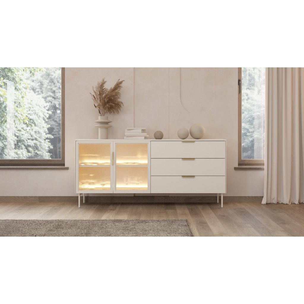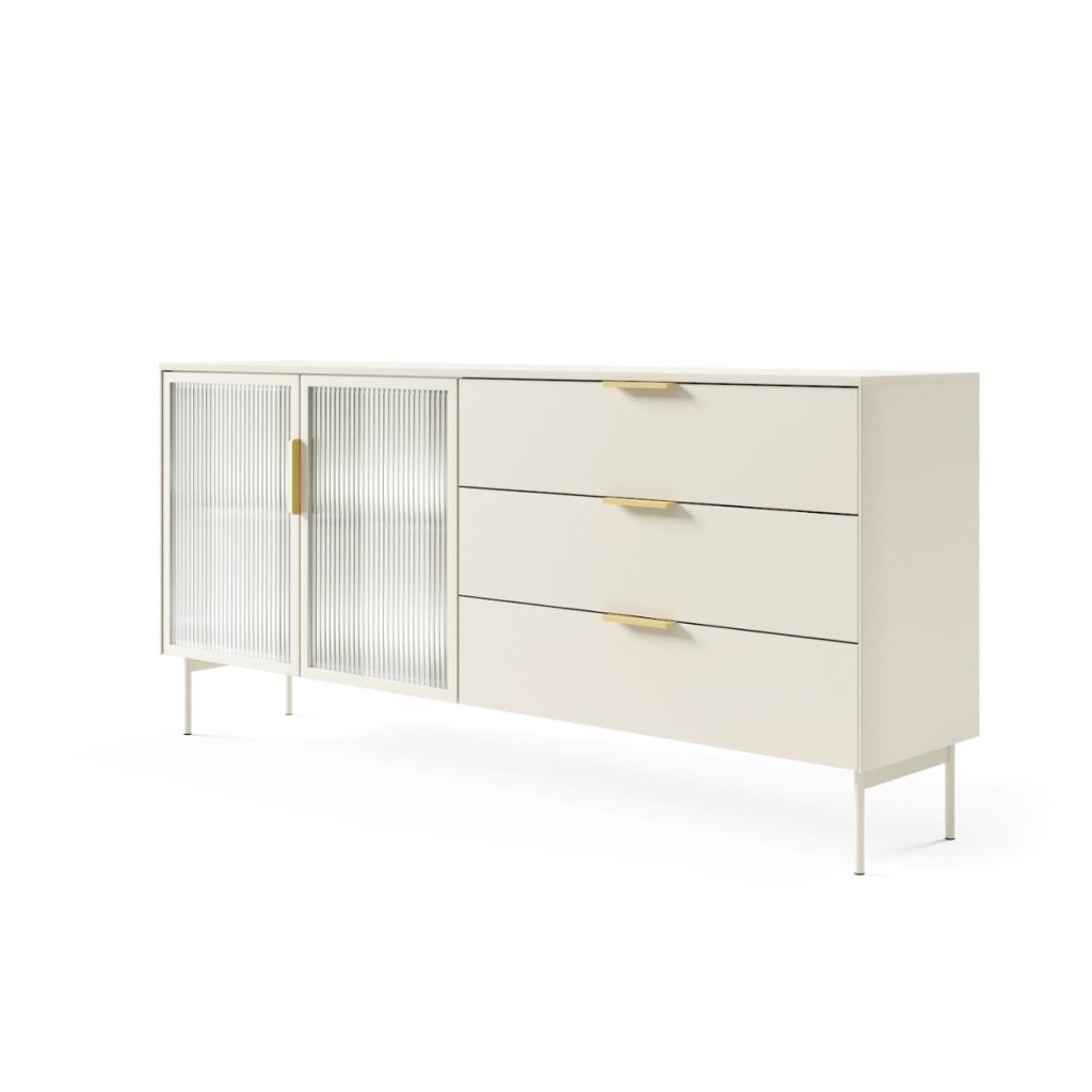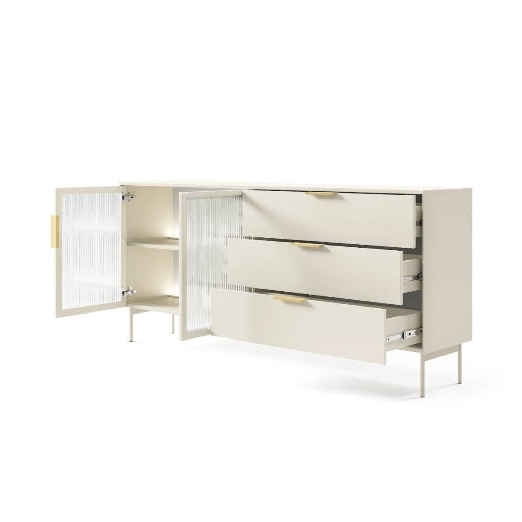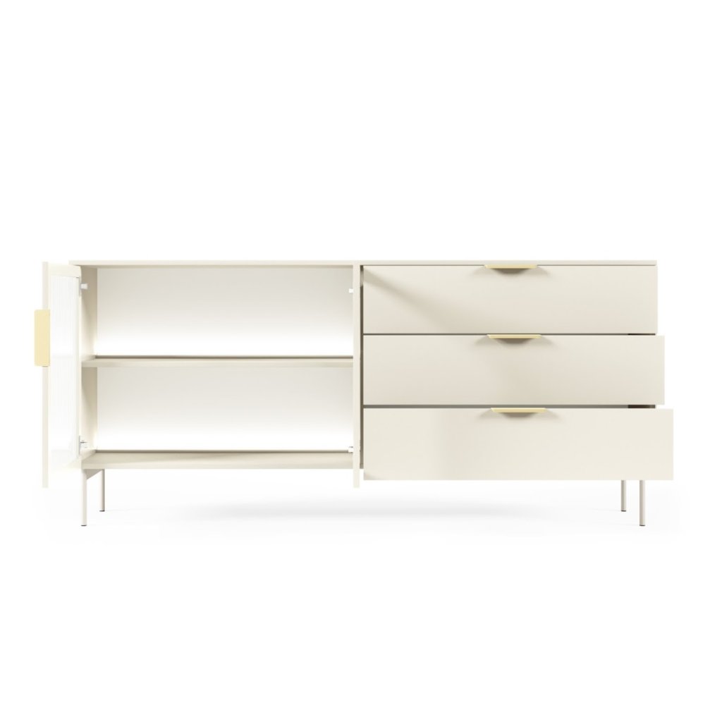 Komoda NAIRE 2D3S je elegantným doplnkom interiéru v jemnom a nerušivom odtieni cashmere, doplnená o štýlové zlaté úchytky. Vysoké nohy v rovnakej farbe dodávajú nábytku ľahkosť a vzdušný vzhľad. Súčasťou ceny je aj integrované LED osvetlenie v príjemnej studenobielej farbe, ktoré zvýrazní moderný charakter komody. Priestranné zásuvky a police poskytujú dostatok miesta na uloženie vašich vecí. Moderný bezúchytkový systém otvárania push-to-open zabezpečuje pohodlné a elegantné používanie.
