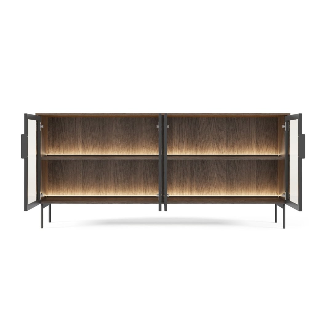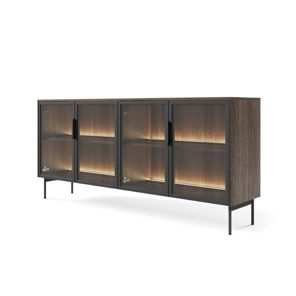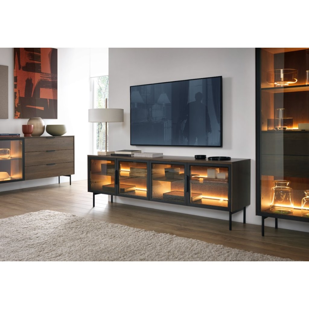 Komoda NAIRE 4D je štýlovým doplnkom každého moderného interiéru, ktorý vyniká svojím elegantným a nadčasovým dizajnom. Tmavé farebné prevedenie dub dunin v kombinácii s čiernymi úchytkami a vysokými nohami v rovnakej farbe pôsobí ľahko, vzdušne a harmonicky. Súčasťou komody je integrované LED osvetlenie v príjemnej teplej bielej farbe, ktoré zvýrazňuje jej moderný charakter a vytvára útulnú atmosféru v miestnosti.