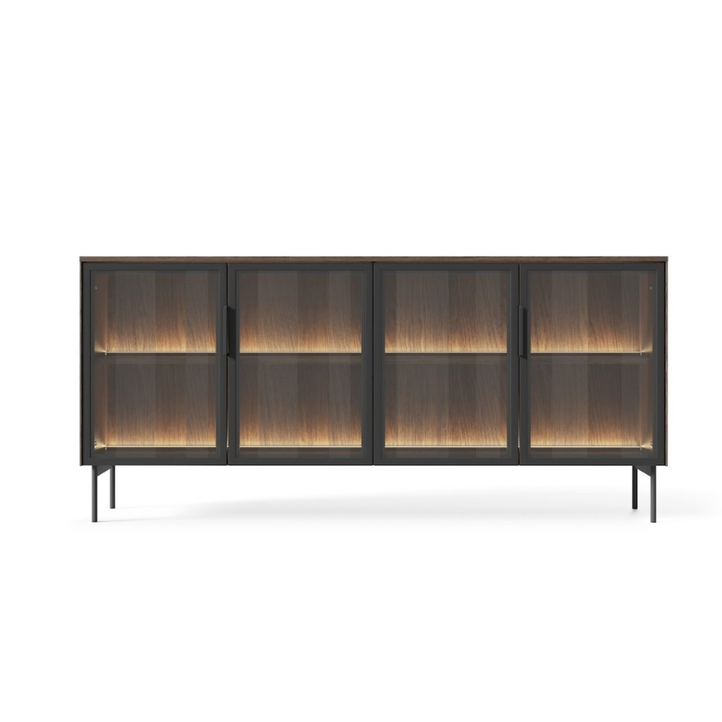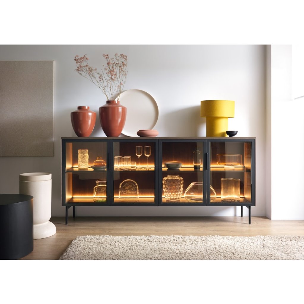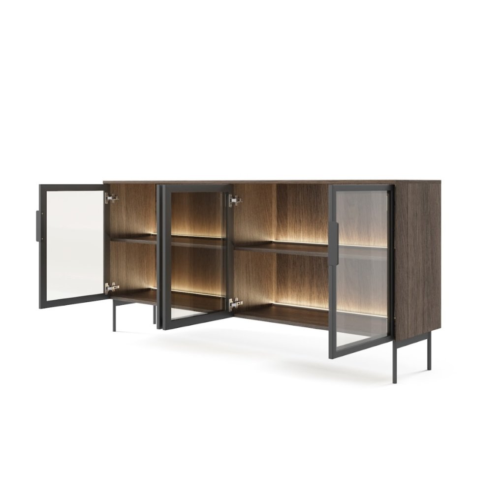 Komoda NAIRE 4D je štýlovým doplnkom každého moderného interiéru, ktorý vyniká svojím elegantným a nadčasovým dizajnom. Tmavé farebné prevedenie dub dunin v kombinácii s čiernymi úchytkami a vysokými nohami v rovnakej farbe pôsobí ľahko, vzdušne a harmonicky. Súčasťou komody je integrované LED osvetlenie v príjemnej teplej bielej farbe, ktoré zvýrazňuje jej moderný charakter a vytvára útulnú atmosféru v miestnosti.
