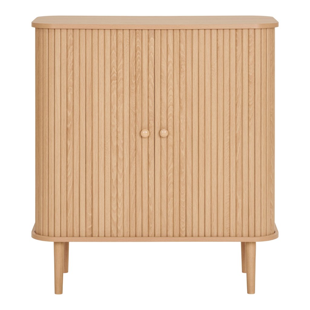 Táto elegantná komoda v prírodnom drevenom dekore vyniká svojím čistým dizajnom a zvislým frézovaním, ktoré jej dodáva jemný štruktúrovaný vzhľad. Praktický úložný priestor za dvojicou dvierok poskytuje miesto na uloženie dokumentov, textílií či doplnkov. Komoda stojí na pevných drevených nohách, ktoré zaisťujú stabilitu a ľahkosť celej konštrukcie. Vďaka svojmu nadčasovému dizajnu sa dokonale kombinuje s ostatnými kúskami z rovnakej kolekcie a zapadne do interiérov v prírodnom, škandinávskom aj modernom štýle.