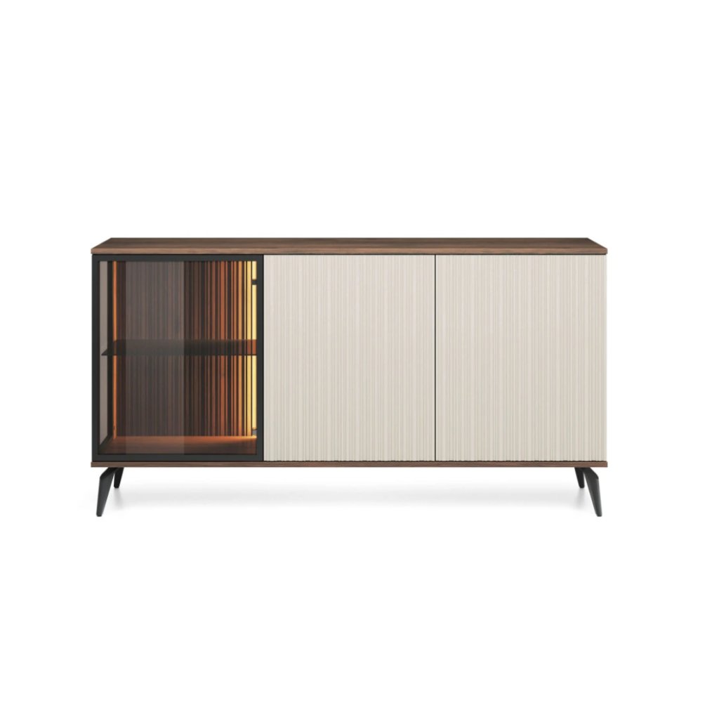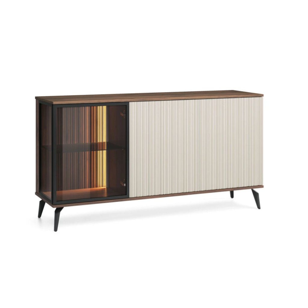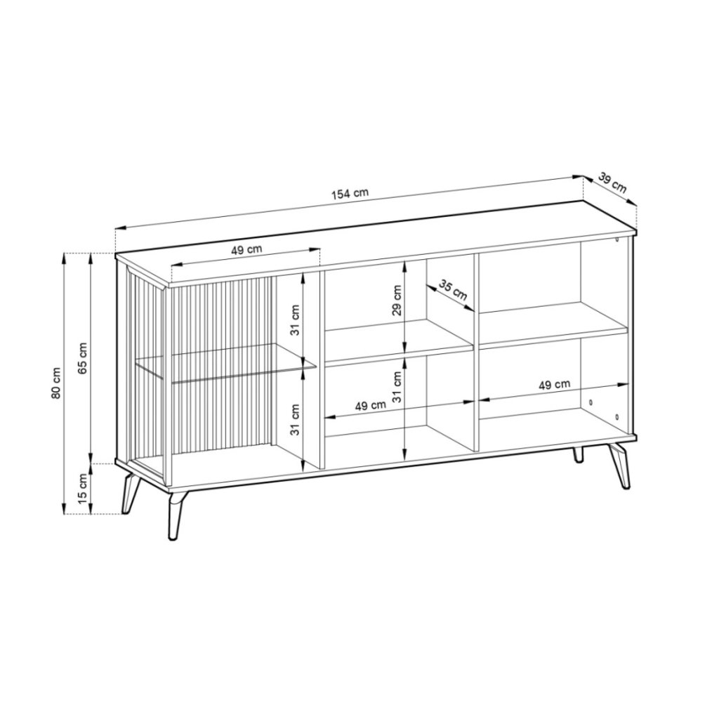 Komoda PURO K-154 zaujme svojím originálnym dizajnom a moderným prevedením, ktoré vynikne v každom interiéri. Je vyrobená z kvalitného a odolného materiálu s ABS hranami, ktoré zaručujú dlhú životnosť a ochranu pred poškodením. Charakteristickým prvkom komody sú čisté a nadčasové línie doplnené o sklenenú vitrínku so zabudovaným LED osvetlením v príjemnej teplej farbe, ktoré vytvára útulnú atmosféru. Zaujímavé dvierka s PUSH TO OPEN systémom otvárania zabezpečujú pohodlné používanie bez úchytiek a podčiarkujú elegantný vzhľad komody. Kovové nožičky dodávajú nábytku stabilitu a ľahkosť, zároveň umožňujú jednoduché čistenie pod komodou, napríklad pomocou robotického vysávača.