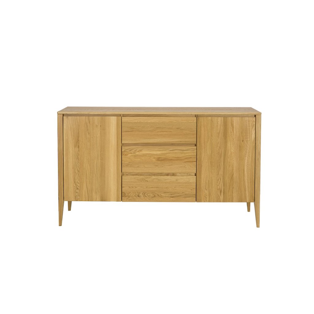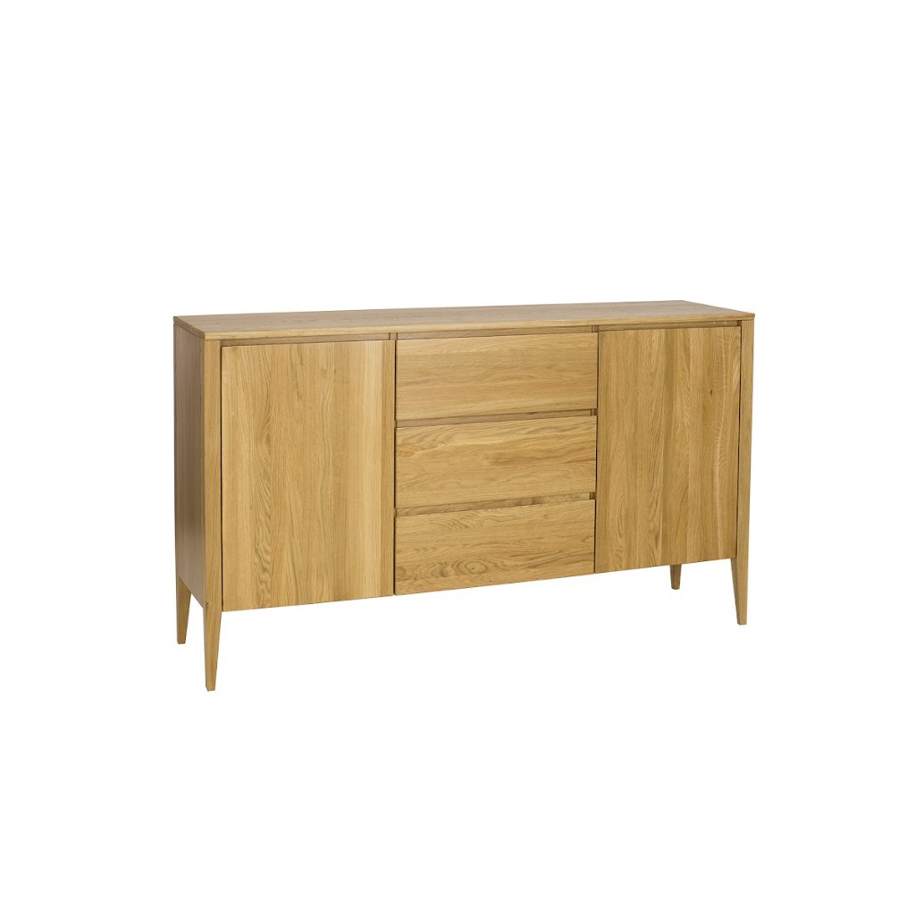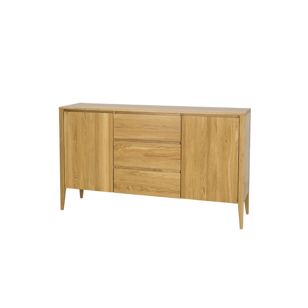 Dizajnová komoda RETRO KD330 z masívneho dubového dreva je ukážkou spojenia minimalistickej estetiky a prvotriedneho remeselného spracovania. Svetlý dub s prirodzenou kresbou dodáva nábytku hrejivý a luxusný charakter, ktorý sa hodí do moderných, škandinávskych aj klasických interiérov. Komoda ponúka dve priestranné skrinky a tri zásuvky – ideálnu kombináciu na uskladnenie riadu, textílií, dokumentov či bytových doplnkov. Bezúchytkové riešenie a čisté línie podčiarkujú dizajn, ktorý nepodlieha trendom.