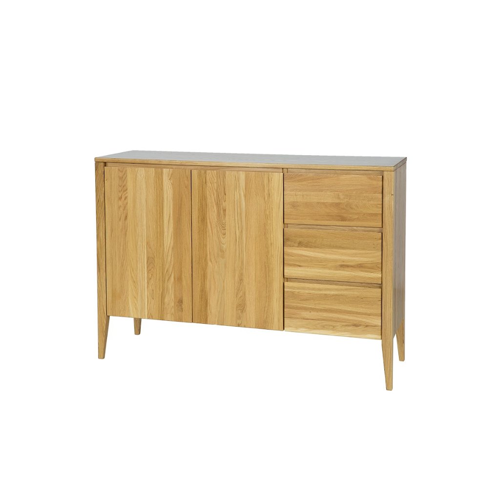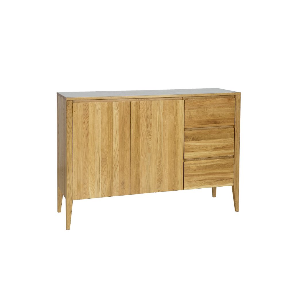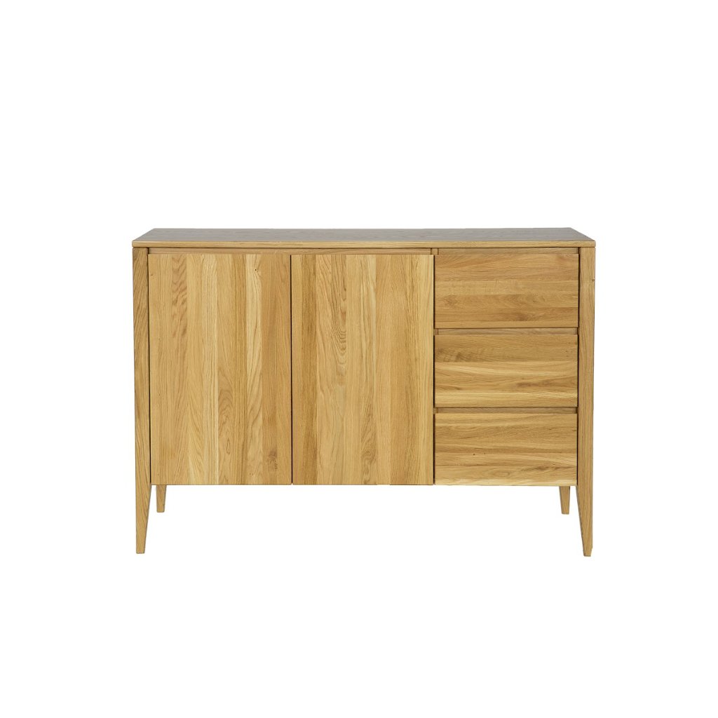Elegantná komoda RETRO KD338 z masívneho dubového dreva spája čistý dizajn, praktický úložný priestor a nadčasovosť prírodného materiálu. V ľavej časti sa nachádzajú dvoje dvierka so skrytým úložným priestorom na riad, textílie alebo dokumenty, v pravej časti sú umiestnené tri priestranné zásuvky pre prehľadnú organizáciu drobností. Minimalistické bezúchytkové riešenie, rovné línie a štíhle nohy z masívu zaručujú, že komoda pôsobí subtílne a esteticky v každom modernom interiéri – či už v obývačke, jedálni, spálni alebo pracovni. Štíhle nohy z masívu odľahčujú celkový vzhľad a dodávajú nábytku subtílny dizajnový výraz.