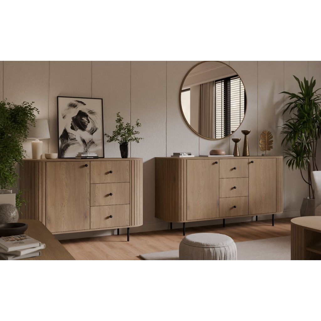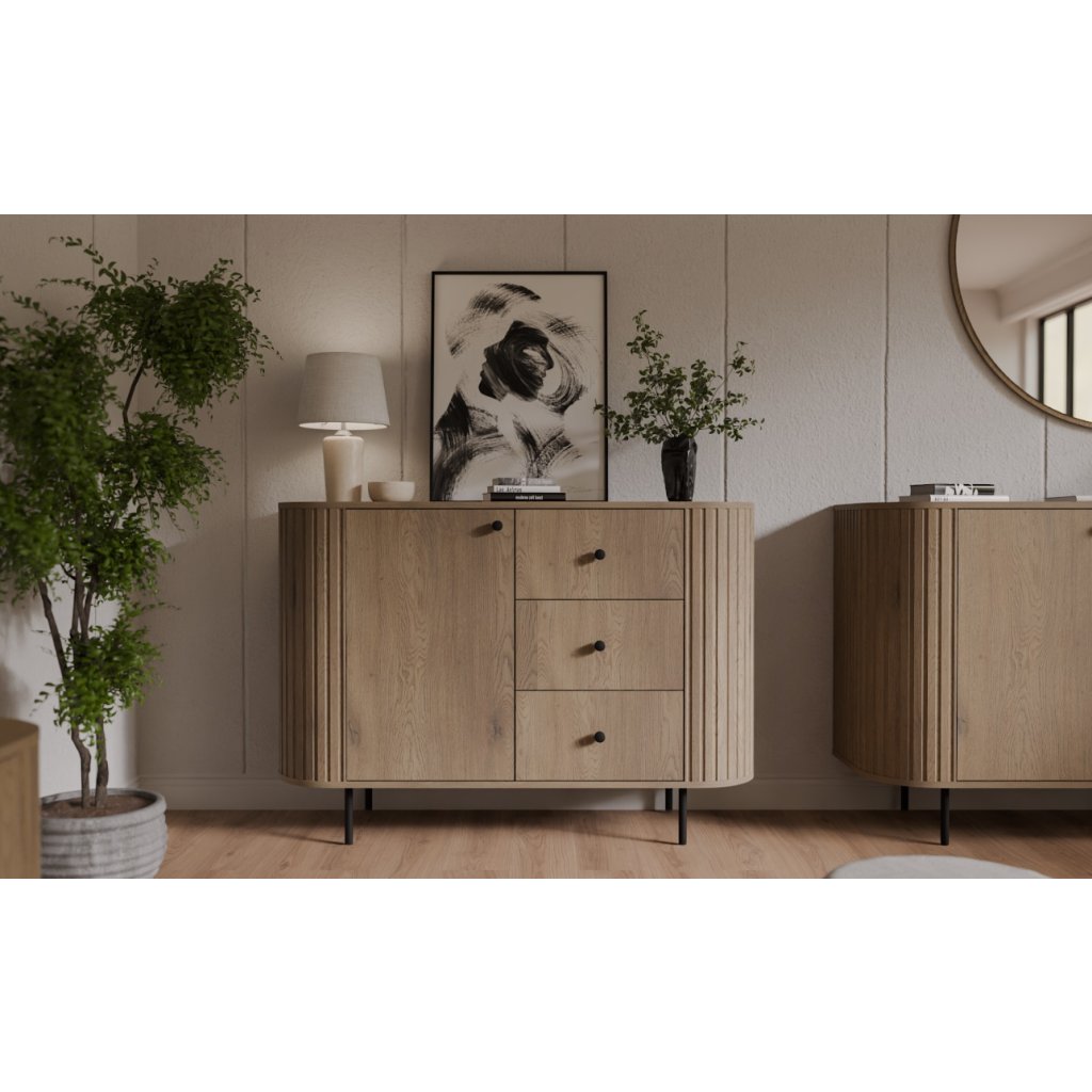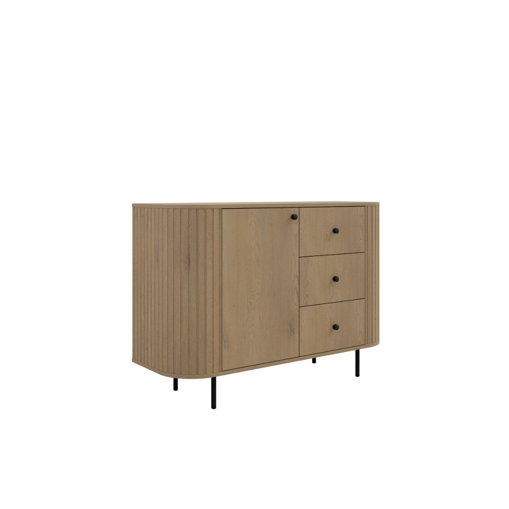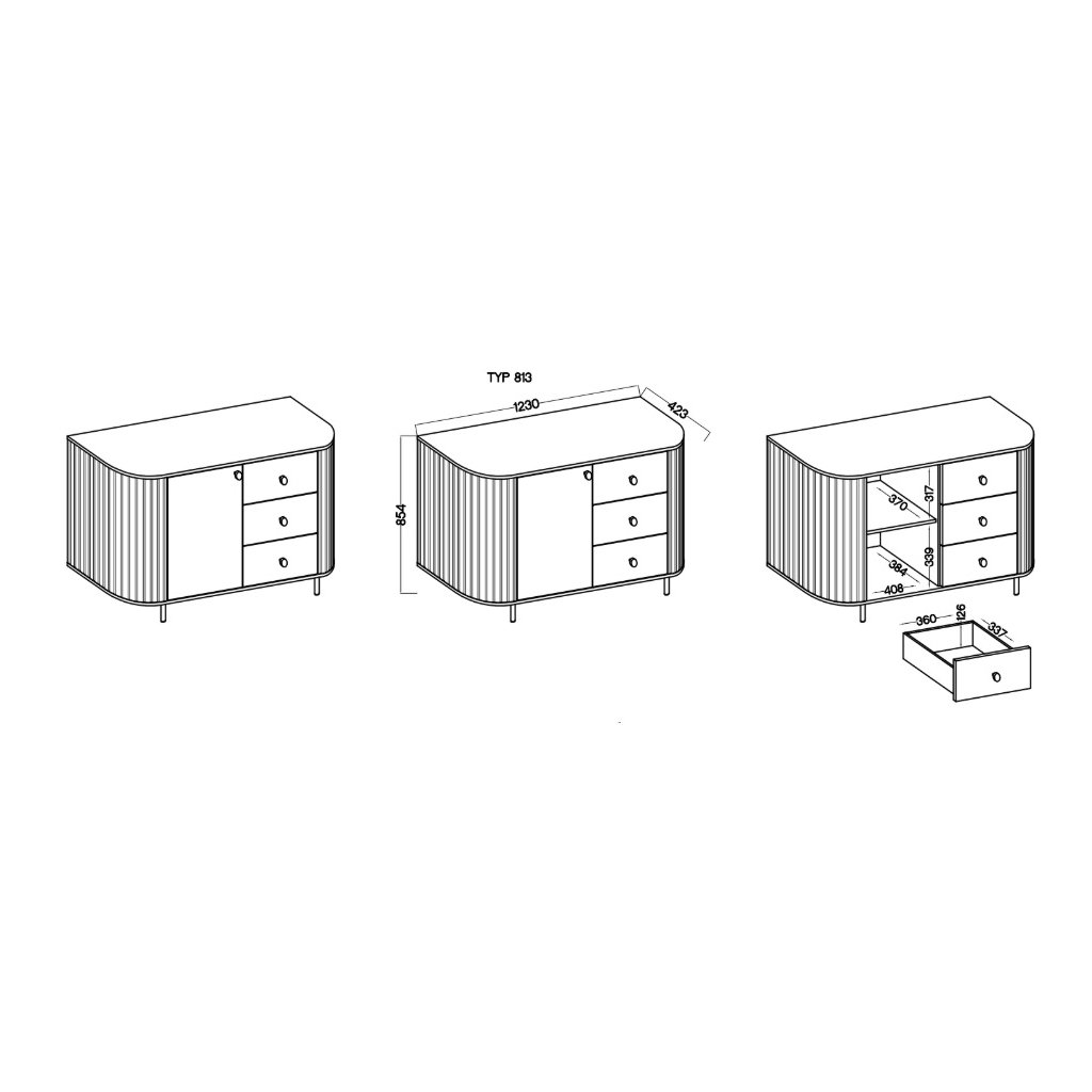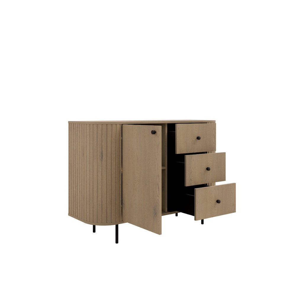 Kolekcia VAOLIA prináša čistý minimalistický dizajn, ktorý oživujú precízne frézované detaily a charakteristicky zaoblené boky, dodávajúce nábytku nový nádych elegancie. Farebné prevedenie kombinuje tlmené, zemité tóny dubu cremona s čiernymi akcentmi, ktoré jemne kontrastujú so svetlým základom. Komoda VAOLIA 1F3S ponúka praktické riešenie v podobe jednej skrinky a troch priestranných zásuviek. Kovové nohy a úchytky v zlatom vyhotovení komodu opticky odľahčujú a dodávajú jej moderný, vzdušný vzhľad.