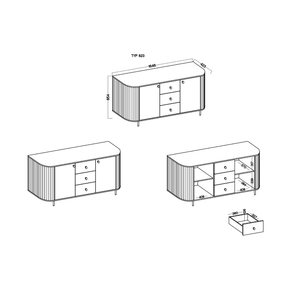 Komoda VAOLIA 2F 3S je vyrobená z laminovanej dosky v kombinácii s MDF materiálom s hrúbkou 16 mm, čo jej zaručuje vysokú pevnosť, odolnosť a dlhú životnosť. Povrchy sú stabilné, nenáročné na údržbu a spoľahlivo odolávajú každodennému používaniu. Moderný vzhľad a stabilitu nábytku zvýrazňujú kovové nohy a úchytky.