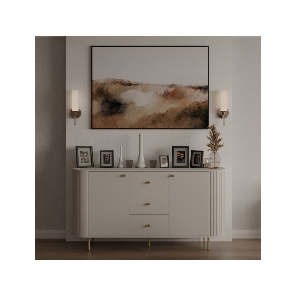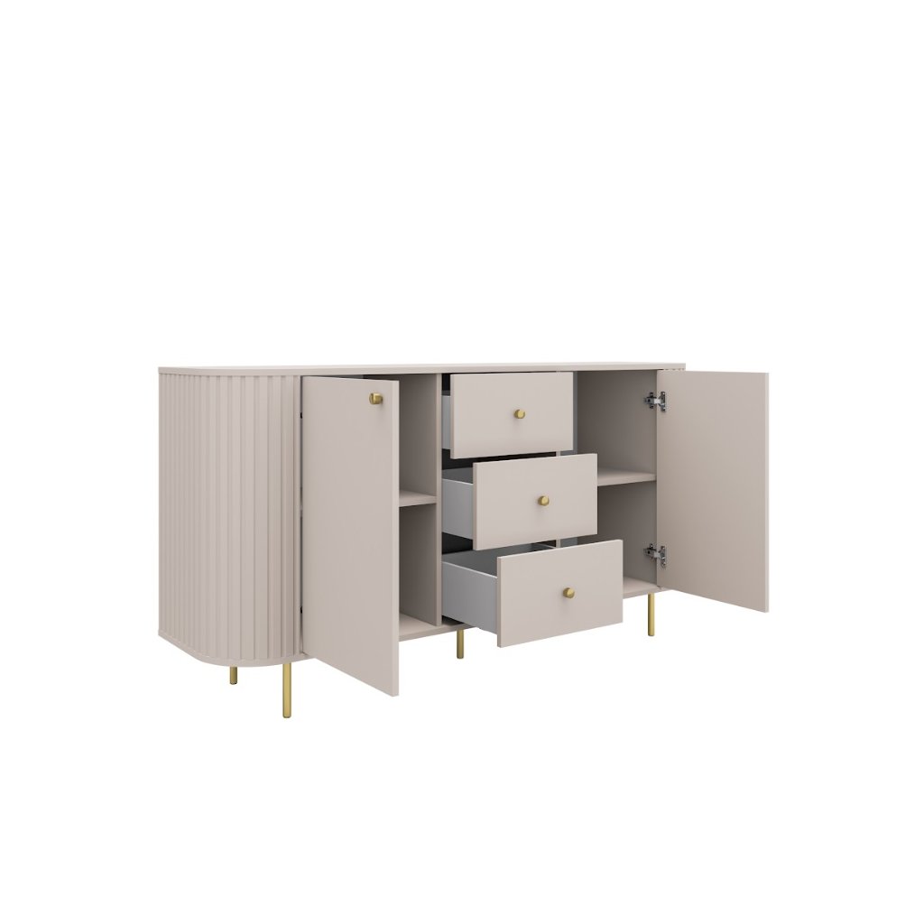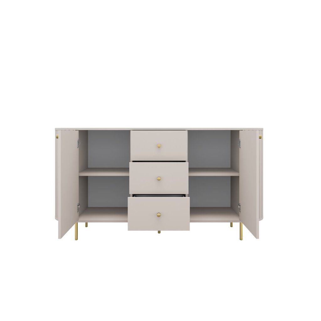 Kolekcia VAOLIA prináša čistý minimalistický štýl, ktorý oživujú precízne frézované detaily a dodávajú interiéru nový dotyk elegancie. Farebné ladenie v tlmených, zemitejších odtieňoch pieskovo béžovej dopĺňajú jemné zlaté akcenty, ktoré príjemne kontrastujú so svetlými tónmi. Komoda VAOLIA 2F 3S ponúka praktické usporiadanie v podobe dvoch dvierok a troch priestranných zásuviek. Kovové nohy a úchytky v zlatom prevedení jej dodávajú ľahkosť, vzdušnosť a moderný vzhľad, bez toho, aby komodu vizuálne zaťažili.