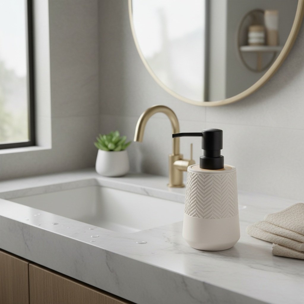 Dávkovač mydla HERMOSA | AWD02191970 je vyrobený z kvalitného materiálu, zaujme štýlovým vzorom rybej kosti, ktorý mu dodáva výrazný vzhľad. Čistenie je veľmi jednoduché.