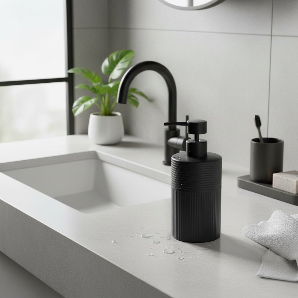 Sýto čierny dávkovač mydla zo série Tusa je elegantným a štýlovým doplnkom pre moderné interiéry. Ozdobné drážky pridávajú dávkovaču jedinečný charakter a zdôrazňujú jeho luxusný dizajn. S kapacitou 400 ml umožňuje dlhodobé používanie bez potreby častého dopĺňania. Dávkovač mydla TUSA | AWD02191916 skvele zapadne do minimalistických a elegantných kúpeľňových aranžmánov, kde vytvorí sofistikovaný akcent kúpeľne.
