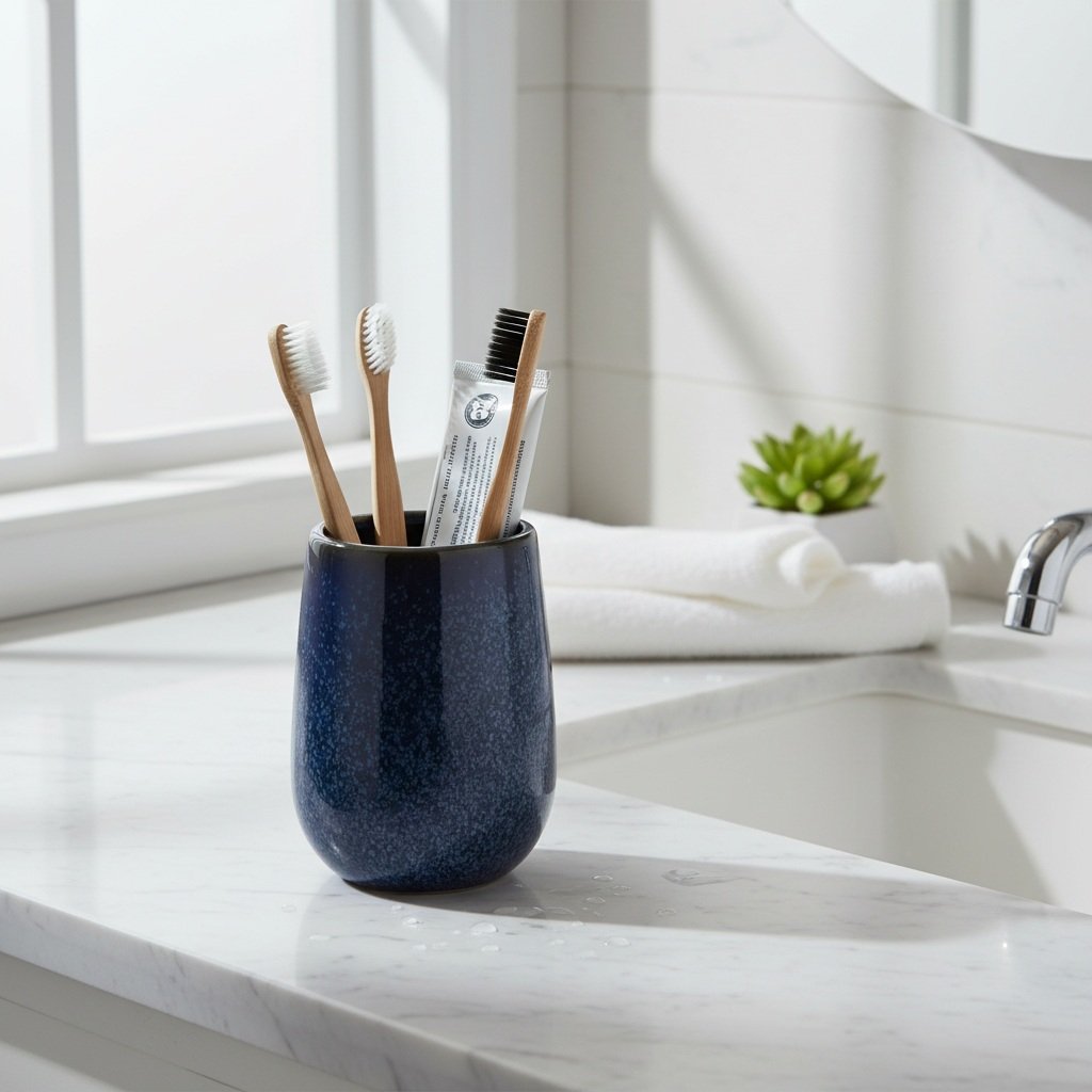Pohár na kefky FRIKI | AWD021919210 v elegantnom námornícky modrom odtieni dodá vašej kúpeľni štýlový a moderný vzhľad. Jeho originálny škvrnitý dizajn vytvára jedinečný vizuálny prvok, ktorý oživí každý interiér. Vďaka svojmu nadčasovému spracovaniu ponúka dokonalú kombináciu praktickosti a estetickej elegancie, ktorá sa hodí do rôznych štýlov kúpeľní.