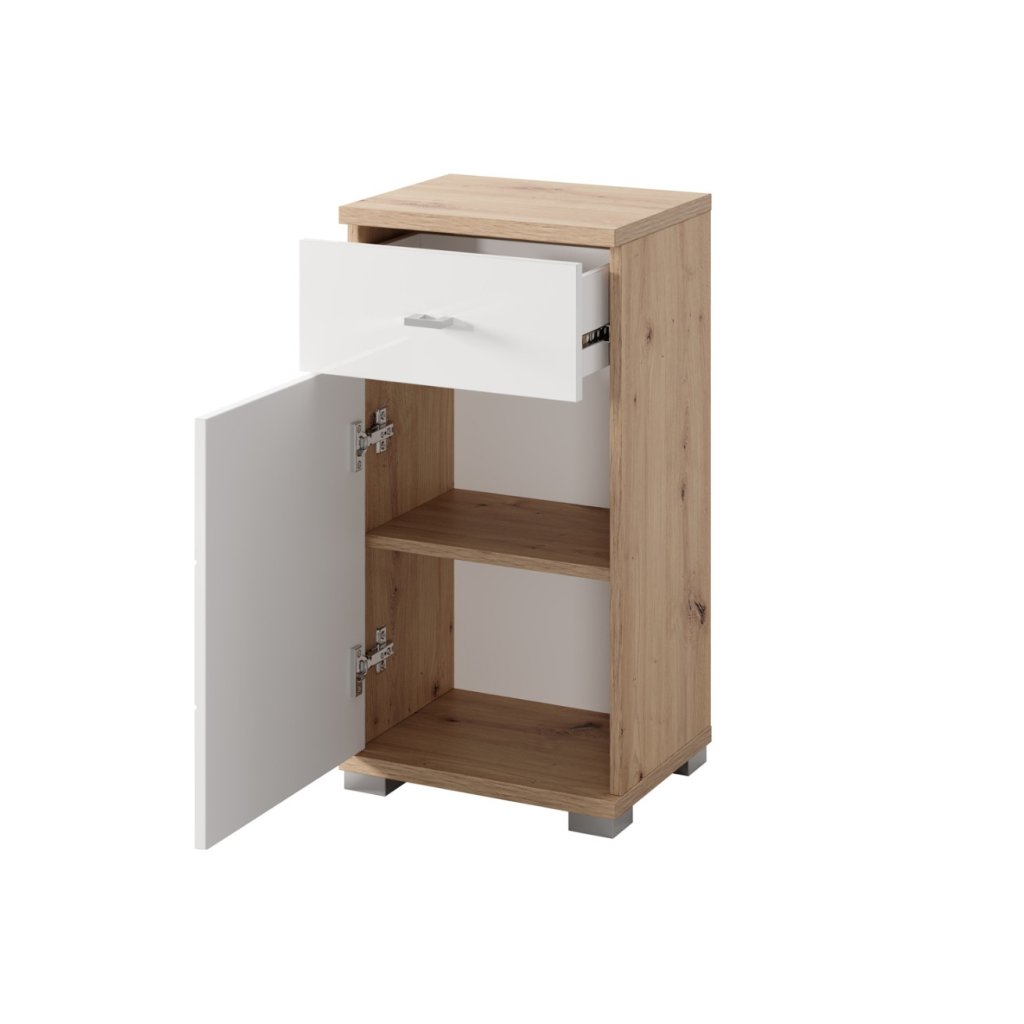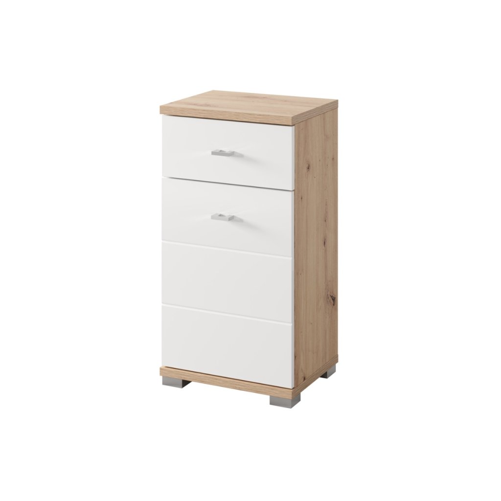 Kúpeľňová skrinka nízka STING 45 spája modernú eleganciu s prirodzeným štýlom. Kombinácia bieleho vysokého lesku a dekoru dub artisan prináša do interiéru sviežosť, ľahkosť a čistotu. Detaily ako chrómové úchytky či precízne frézované čelá dodávajú skrinke noblesu a jedinečný charakter. Nábytok zo série STING nie je len estetickým doplnkom – vnáša do kúpeľne harmonickú atmosféru, ktorá podporuje relax a pohodlie. Model STING 45 je prakticky riešený – za jednými dvierkami sa nachádza polica, ktorá poskytuje úložný priestor na vaše kúpeľňové potreby.