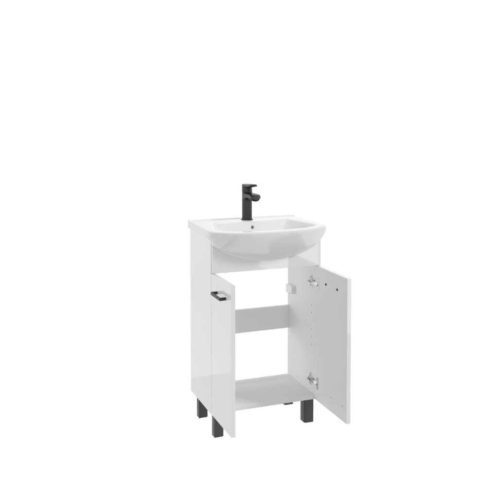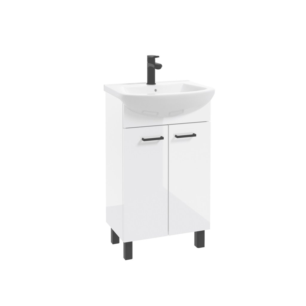 Kúpeľňová skrinka s umývadlom NOVELTY White D50 | 50 cm v elegantnom bielom lesku prinesie do vašej kúpeľne sviežosť a moderný vzhľad. Lesklá povrchová úprava krásne odráža svetlo a opticky zväčšuje priestor. Skrinka je doplnená o čierne nohy a úchytky, ktoré vytvárajú výrazný kontrast a dodávajú celku štýlový charakter. Súčasťou balenia je biele umývadlo Tomaso, pričom praktická dvojdverová skrinka ponúka dostatok úložného priestoru. Doprajte svojej kúpeľni dotyk luxusu, ktorý si zaslúži.