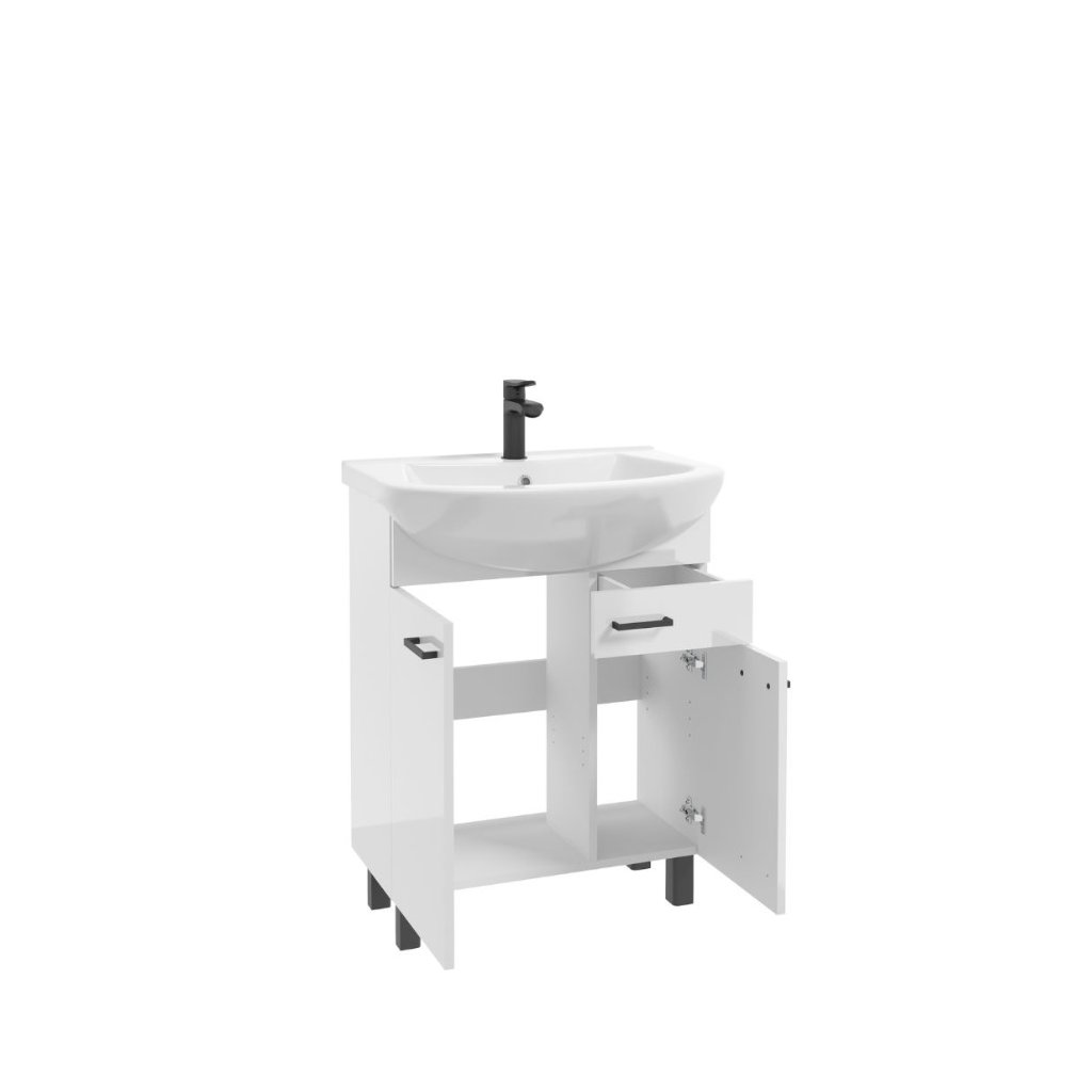 Kúpeľňová skrinka s umývadlom NOVELTY White D65 2D1S | 65 cm v modernom bielom lesku dodá vašej kúpeľni eleganciu a sviežosť. Lesklá povrchová úprava krásne odráža svetlo a opticky rozjasňuje priestor. Skrinka je doplnená o čierne nohy a úchytky, ktoré vytvárajú štýlový kontrast. Praktická dvojdverová konštrukcia so zásuvkou ponúka dostatok úložného priestoru na všetky potrebné kúpeľňové doplnky. Súčasťou balenia je biele umývadlo Tomaso. Doprajte svojej kúpeľni dotyk luxusu, ktorý si zaslúži.