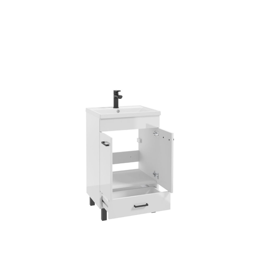 Kúpeľňová skrinka s umývadlom NOVELTY White D50 2D1S | 50 cm v modernom bielom lesku dodá vašej kúpeľni sviežosť a nadčasovú eleganciu. Lesklá povrchová úprava krásne odráža svetlo a opticky rozjasňuje priestor. Skrinka je doplnená o čierne nohy a úchytky, ktoré vytvárajú moderný kontrast. Praktické usporiadanie s dvierkami a zásuvkou poskytuje dostatok miesta na uloženie kúpeľňových doplnkov. Súčasťou balenia je biele umývadlo Barcelona 50. Doprajte svojej kúpeľni dotyk luxusu, ktorý si zaslúži.