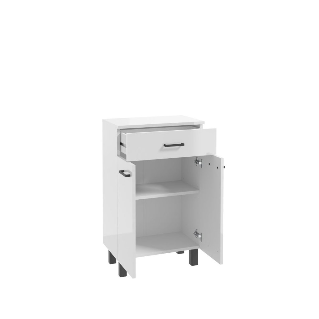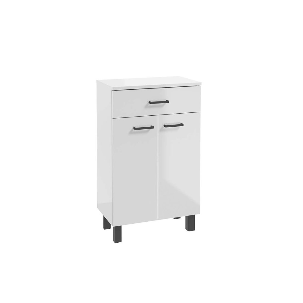 Kúpeľňová skrinka NOVELTY White B50 v modernom bielom lesku dodá vašej kúpeľni sviežosť a nadčasovú eleganciu. Lesklá povrchová úprava krásne odráža svetlo a opticky rozjasňuje priestor. Skrinka je doplnená o čierne nohy a úchytky, ktoré vytvárajú atraktívny kontrast. Praktické riešenie v podobe dvoch dvierok so zásuvkou a policou poskytuje dostatok úložného priestoru na všetky potrebné doplnky. Súčasťou je biela doska, ktorá harmonicky dopĺňa celkový dizajn. Doprajte svojej kúpeľni dotyk luxusu, ktorý si zaslúži.