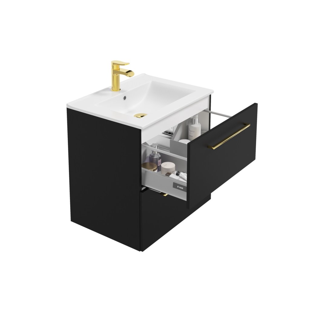 Skrinka pod umývadlo FERATA D60/45 v elegantnom čiernom prevedení je moderným riešením pre každú kúpeľňu. Dve priestranné zásuvky ponúkajú dostatok miesta na odkladanie kozmetiky, uterákov či čistiacich prostriedkov, vďaka čomu zostane priestor vždy uprataný. Skrinku si navyše môžete prispôsobiť podľa vlastného štýlu, jednoducho ju skombinujete s rôznymi dizajnovými úchytkami dostupnými v rôznych farbách (úchytky nie sú súčasťou balenia). Pre ešte štýlovejší vzhľad je možné doplniť ju o elegantné nohy Sky, ktoré sú dostupné ako samostatný doplnok.